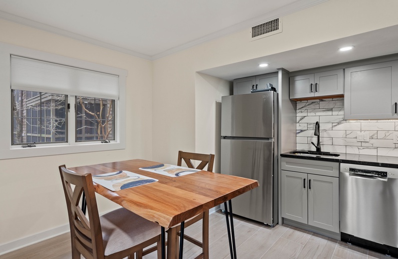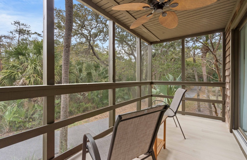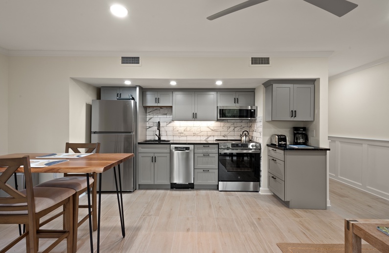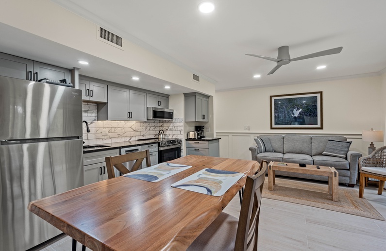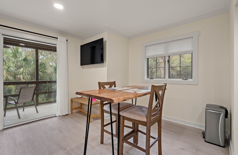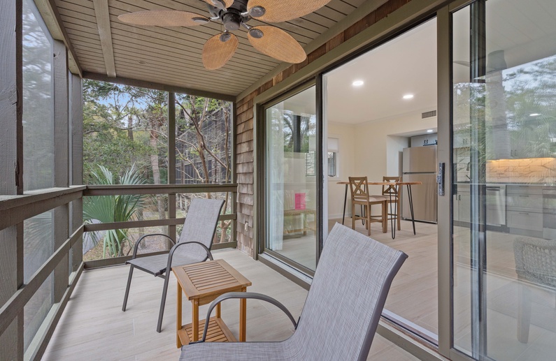 The main living space is furnished with a sofa, accent chair and a wall-mounted TV. Accessible off the living area is a screened in porch. It offers two chairs and a side table, where you can enjoy the morning breeze with a cup of coffee, or enjoy the sounds of Kiawah’s nature with an evening cocktail after a long day on the beach. The fully equipped kitchen boasts sleek gray cabinetry and a modern marble inspired backsplash. Just off the kitchen is a dining table for two.