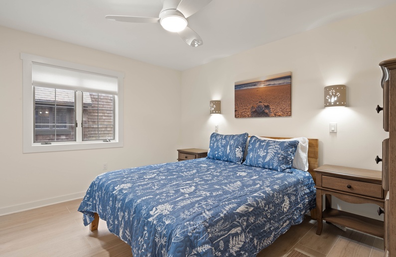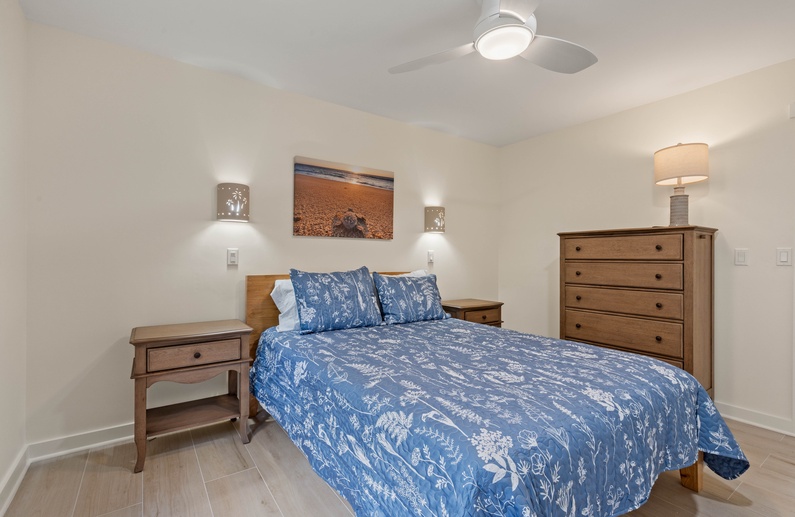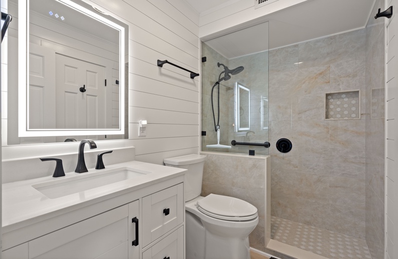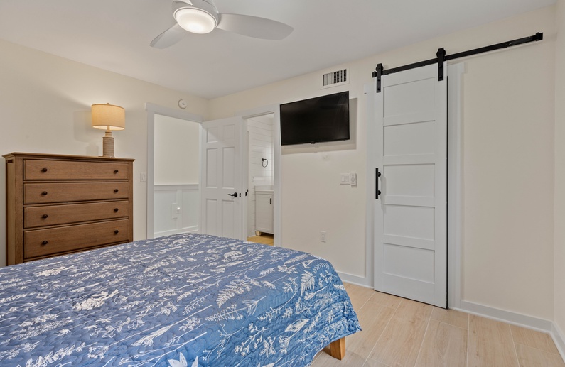 Walk down the hall near the entrance of the villa to find the primary bedroom. It provides a comfortable king size bed, tall dresser as well as a TV, perfect to unwind after a busy and fun-filled day. The attached bathroom, also accessible from the hall, has a beautiful white vanity, lighted mirror, stunning shiplap details and a striking walk-in shower.