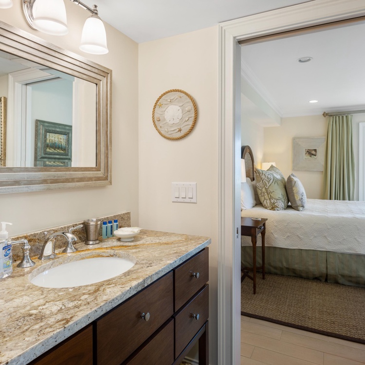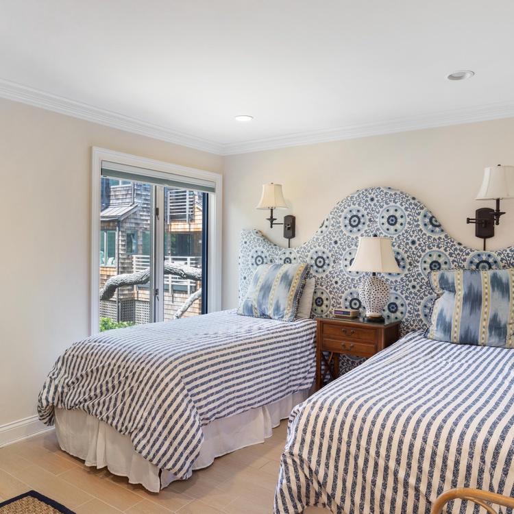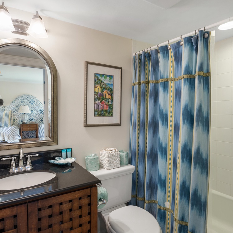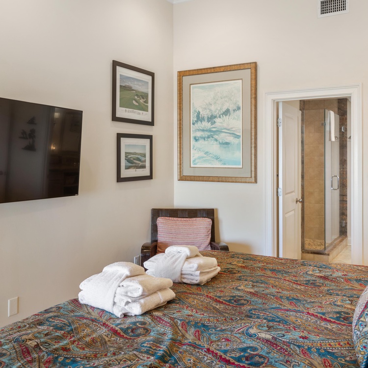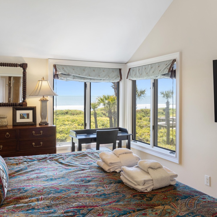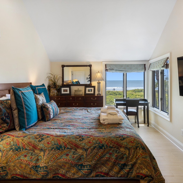 The primary suite offers views of the ocean, a king-sized bed, and a writing desk with a chair. The private primary bathroom is equipped with a tiled shower, large double sink vanity, and walk-in closet. The queen bedroom has lovely views of the ocean and access to the deck. The bedroom has its own door to access the hall bathroom. This bathroom features a walk-in shower and large vanity with a single sink. The third bedroom has twin beds, which can also be pushed together to make a king-sized bed with the custom wall-mounted headboard. The bedroom has an attached bathroom with a shower/tub combo.