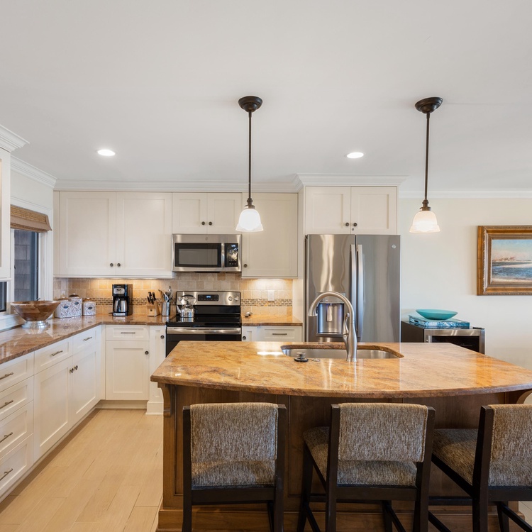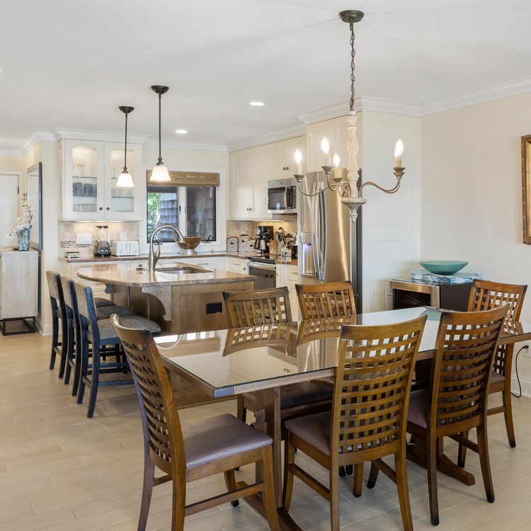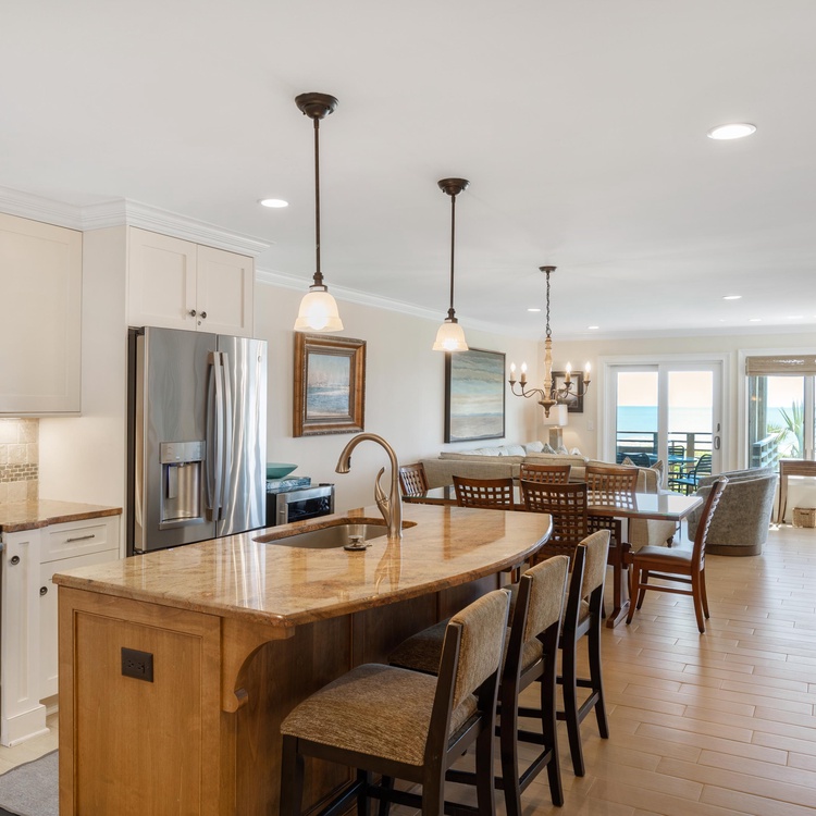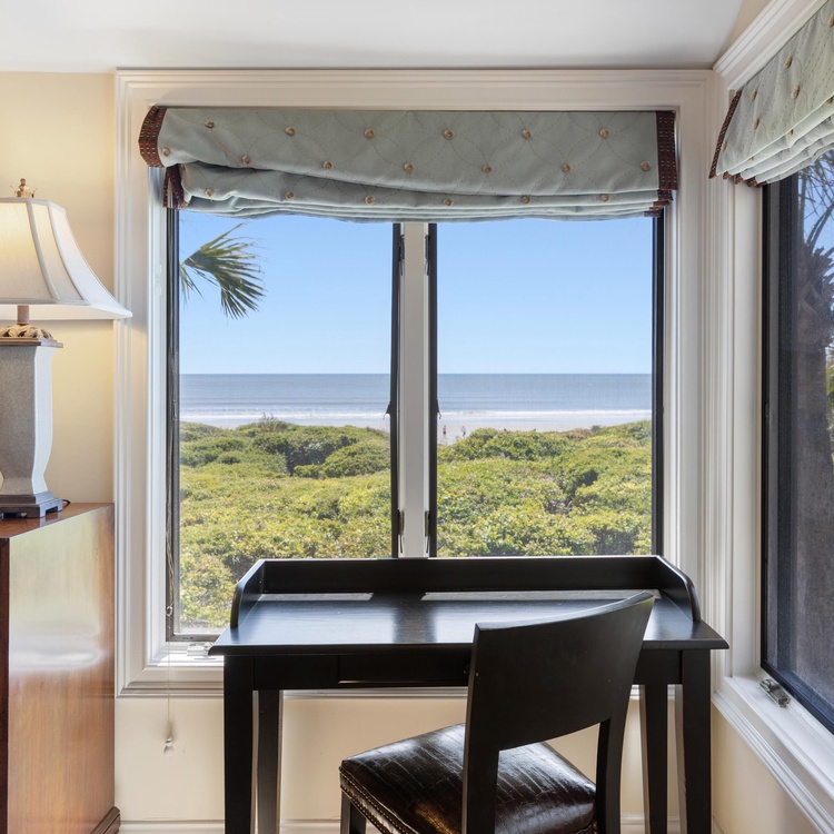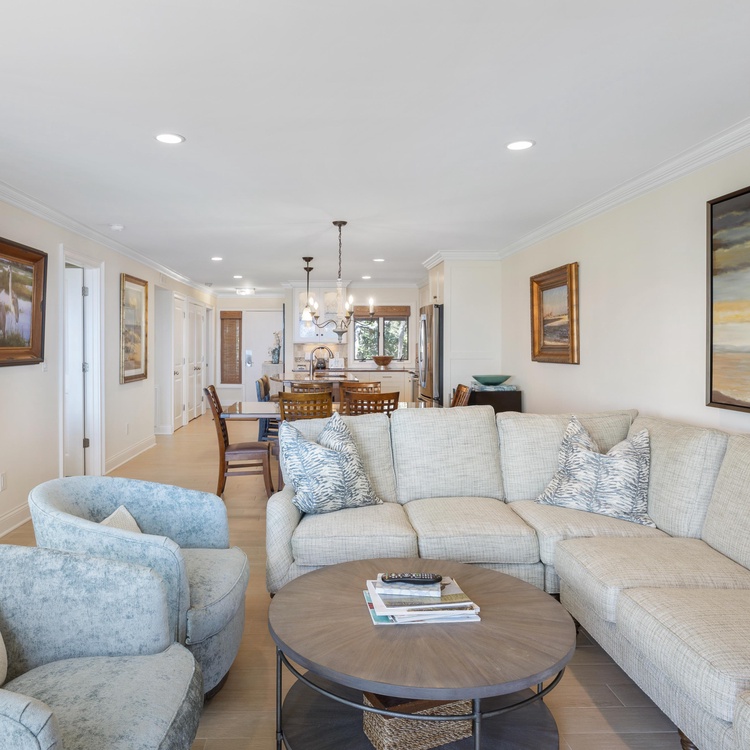 When you enter this Windswept Villa, you are welcomed by the Kiawah ocean views. The entry has beautiful tile and a renovated kitchen with all stainless steel appliances, custom cabinetry, granite countertops, and a large center island with bar seating for three. The custom-crafted dining room table with seating for six is perfect for enjoying meals with family and friends. The living room offers a new comfortable sectional sofa and large flat screen TV and is brightened by many windows and doors facing the ocean.