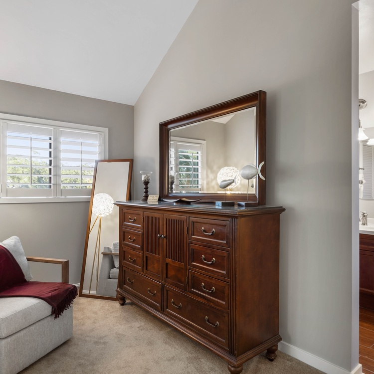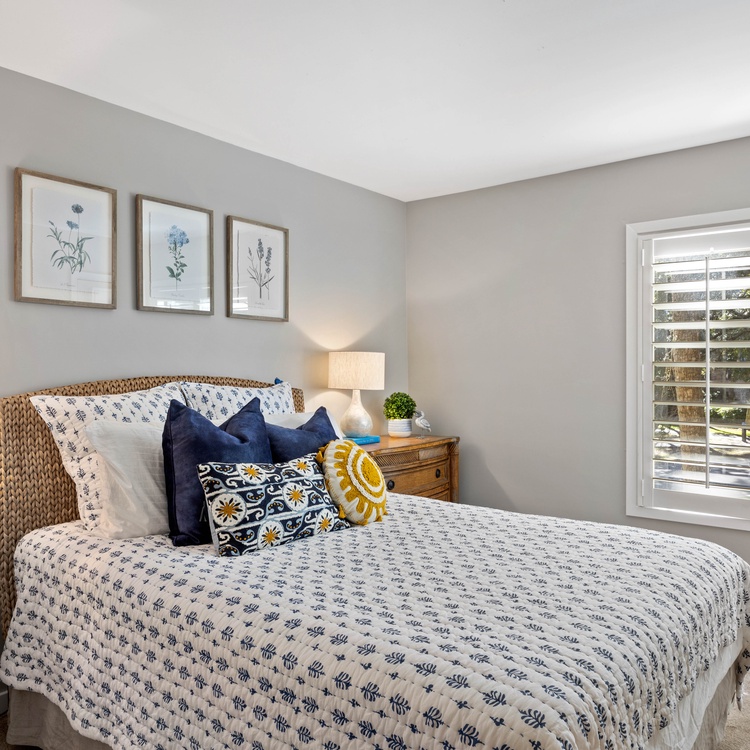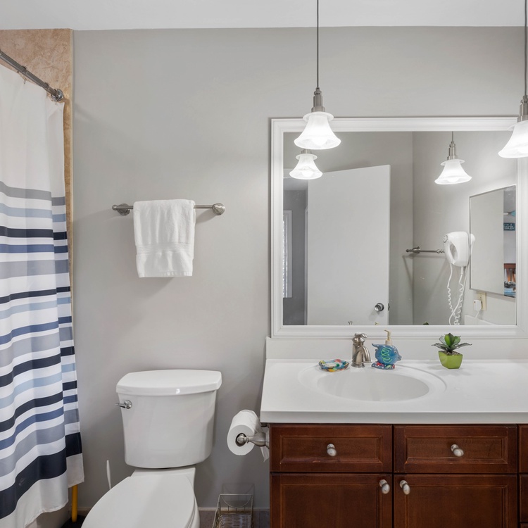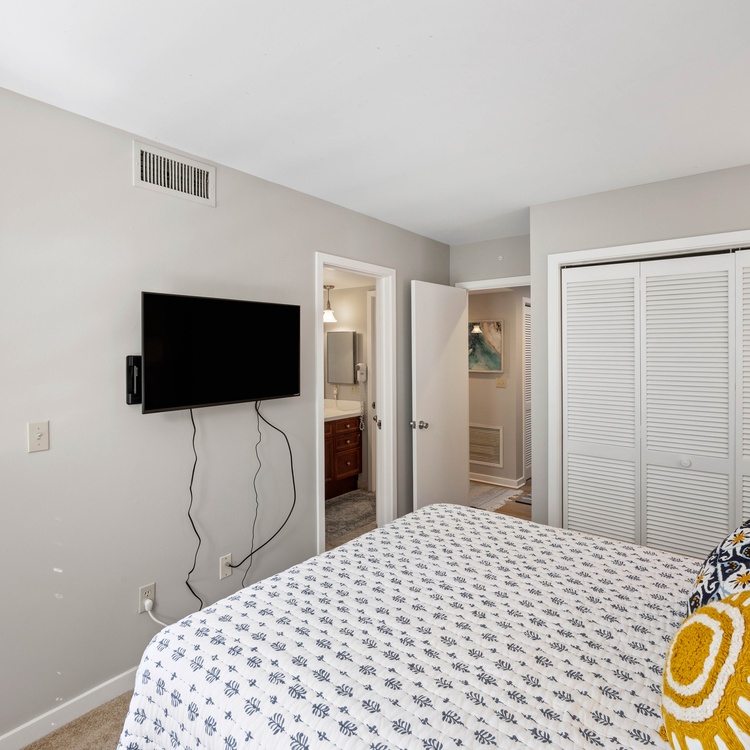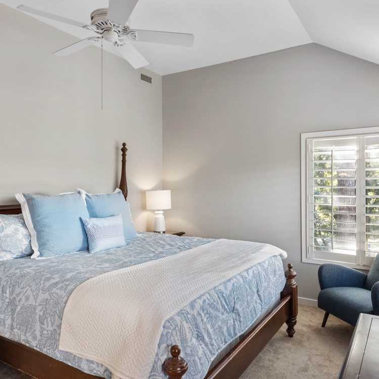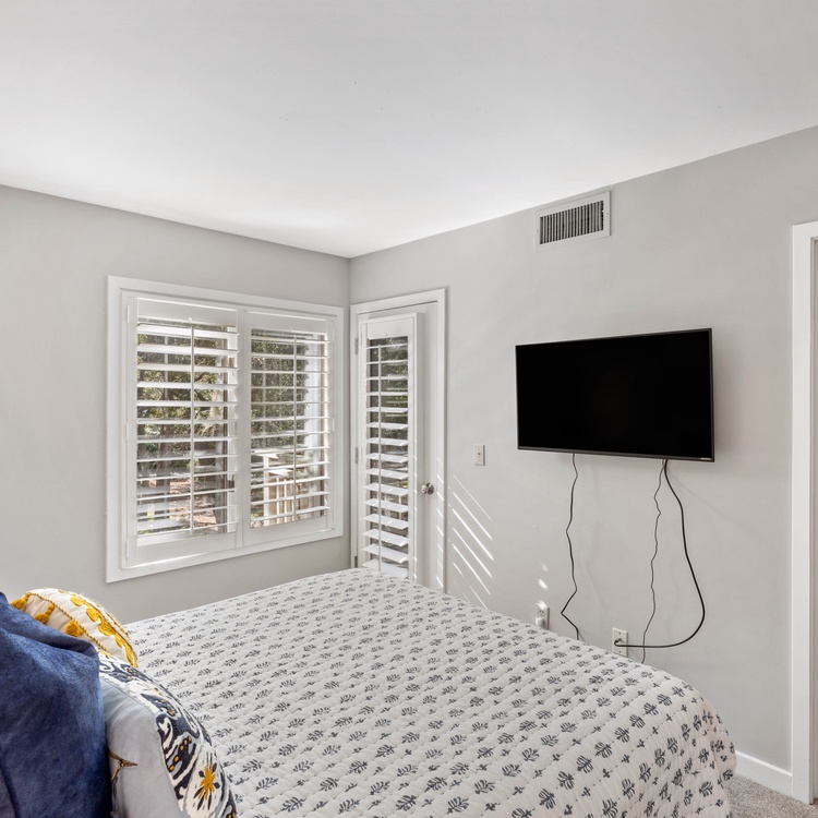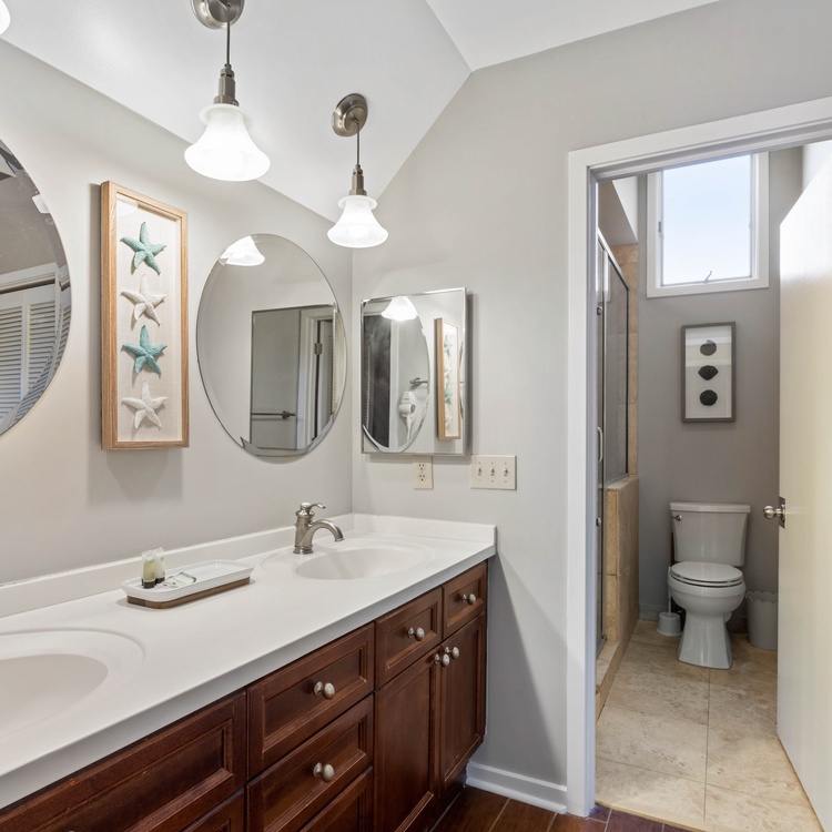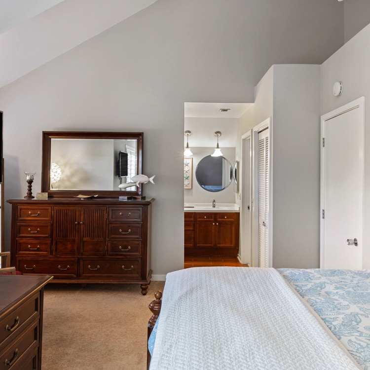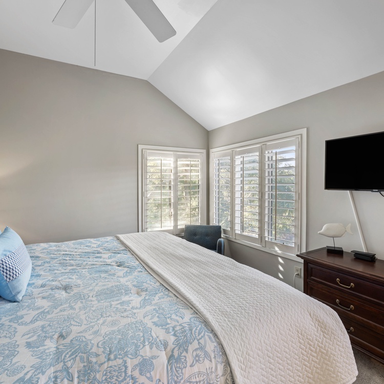 The villa has three bedrooms, two on the second floor and one on the first floor. The first-floor bedroom, featuring soothing coastal décor, has a queen-sized bed, flat-screen TV, and access to the deck. The attached bathroom, also accessible from the hall, has a spacious walk-in shower and large vanity. The primary suite, located upstairs, boasts a king-sized bed, wall-mounted TV, and soothing lagoon views. The chic primary bathroom has a double-sink vanity and walk-in shower with a bench seat. The third bedroom, also located upstairs, has two twin-sized beds and a small flat-screen TV. The attached bathroom has a shower/tub combo.
