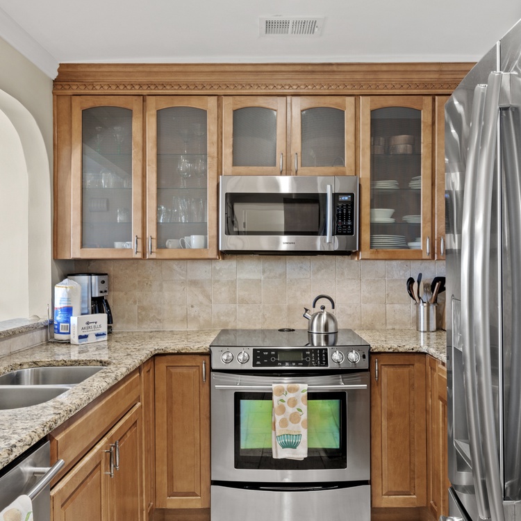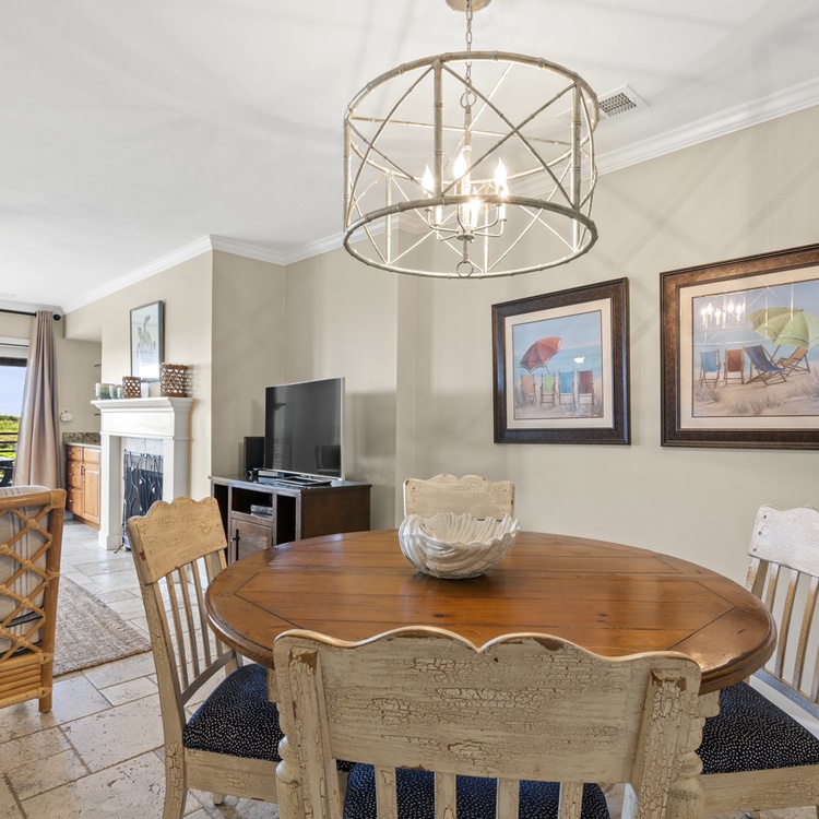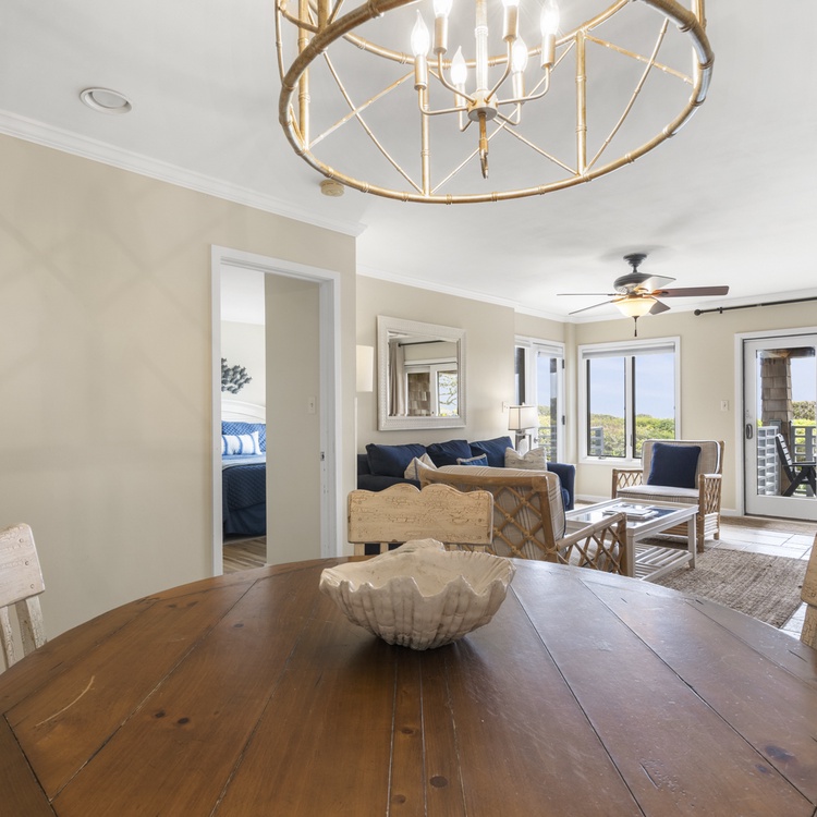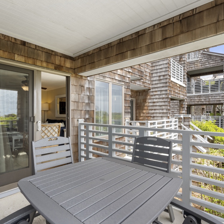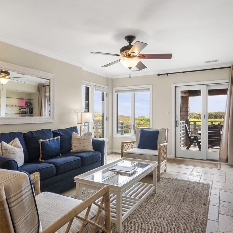Upon entering this first-floor villa, you’ll find ample living space, impeccable foliage and dune views, and soft coastal finishes. The living area offers comfortable seating equipped with a queen-sized sleeper sofa, a TV, sliding door access to the balcony, and access to the deck. The fully equipped kitchen offers ample counter space and stainless steel appliances while overlooking the dining area. Enjoy your vacation meals in the dining area with seating for your whole party.