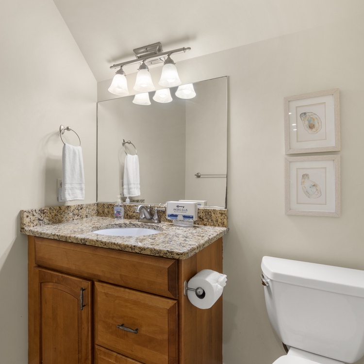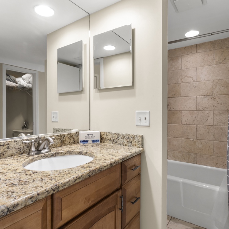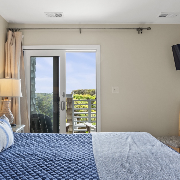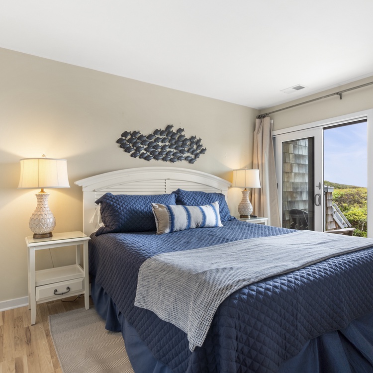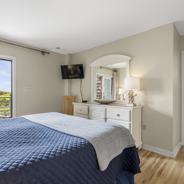 The villa’s primary bedroom features a king-sized bed, a wall-mounted TV, beautiful foliage and dune views, and sliding door access to the deck. The room also provides enough closet space to fully unpack your vacation clothes and unwind. The primary bathroom offers a shower and bathtub combination, and is accessible from both the primary bedroom and the hall.