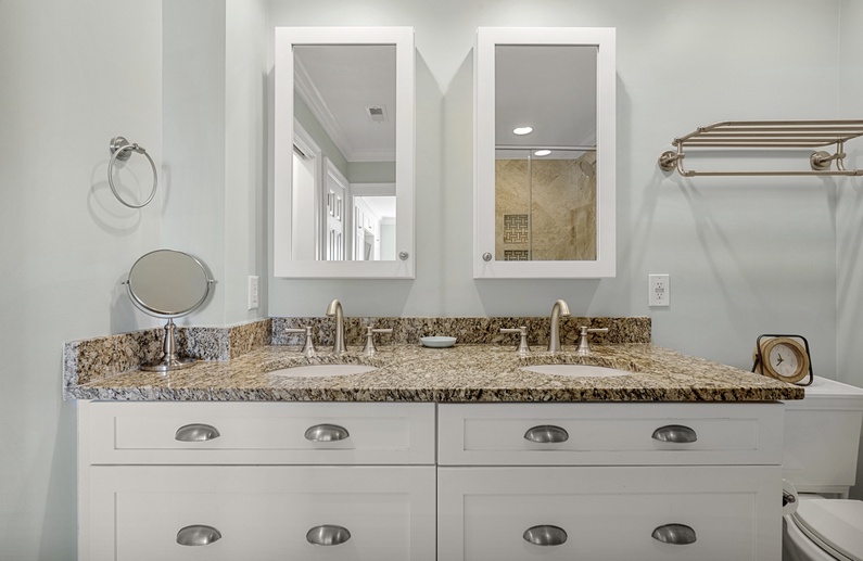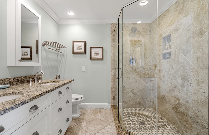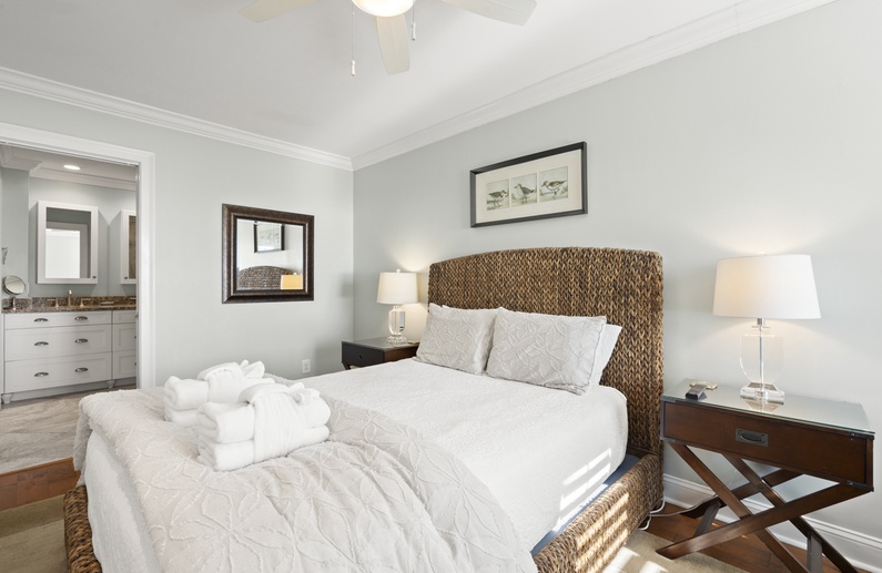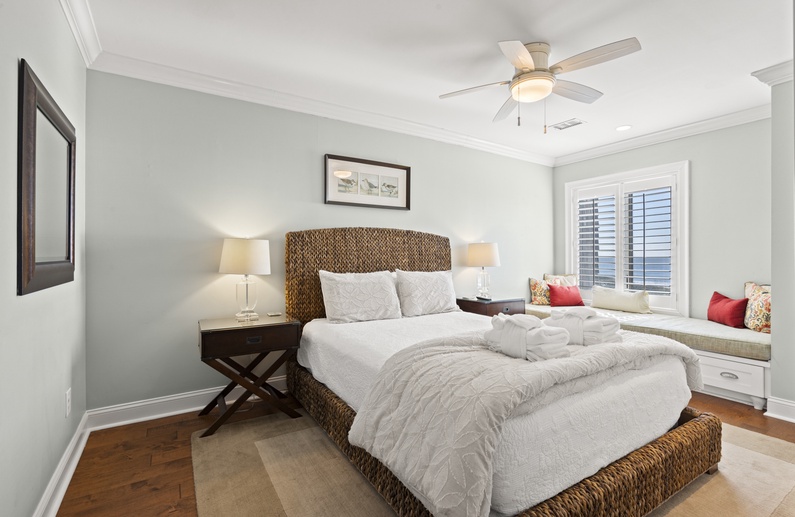 The relaxing bedroom showcases a queen-sized bed, a new flat-screen TV with a soundbar, built-in shelving, and a custom window bench perfect for enjoying the view. The updated en suite bathroom features double sinks and a large tile shower. The villa is also equipped with a half bathroom.
