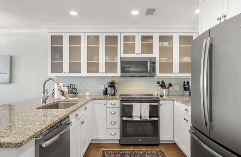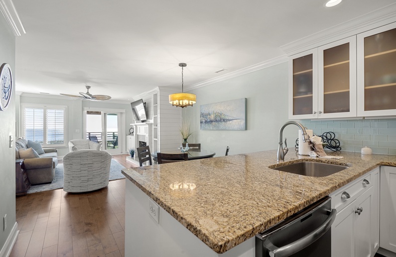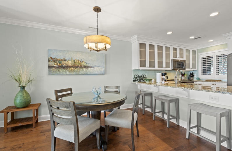 The second-floor villa greets you with abundant natural light, upscale finishes, and hardwood flooring throughout. The inviting living room offers a new flat-screen TV with a soundbar, comfortable seating, and custom cabinetry. A fully equipped kitchen features granite countertops, white cabinets, stainless steel appliances, and barstool seating. The kitchen overlooks the dining area with seating for four guests.