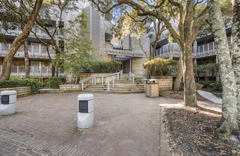 The front exterior entrance of this villa building has a short flight of stairs, with an ADA-compliant ramp up to the first floor, with access to an elevator or use of adjacent stairs.