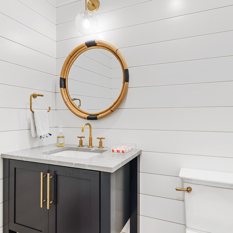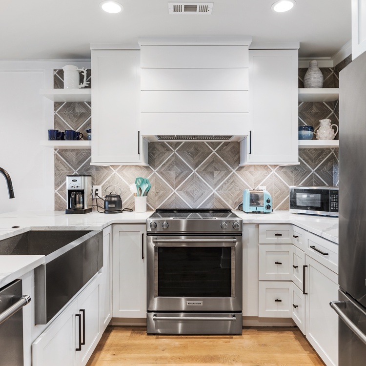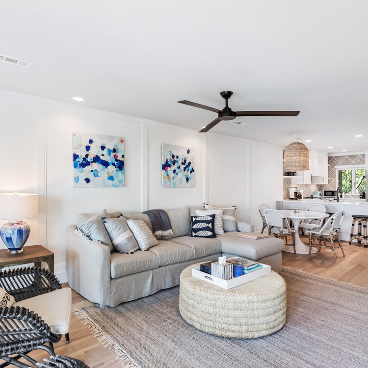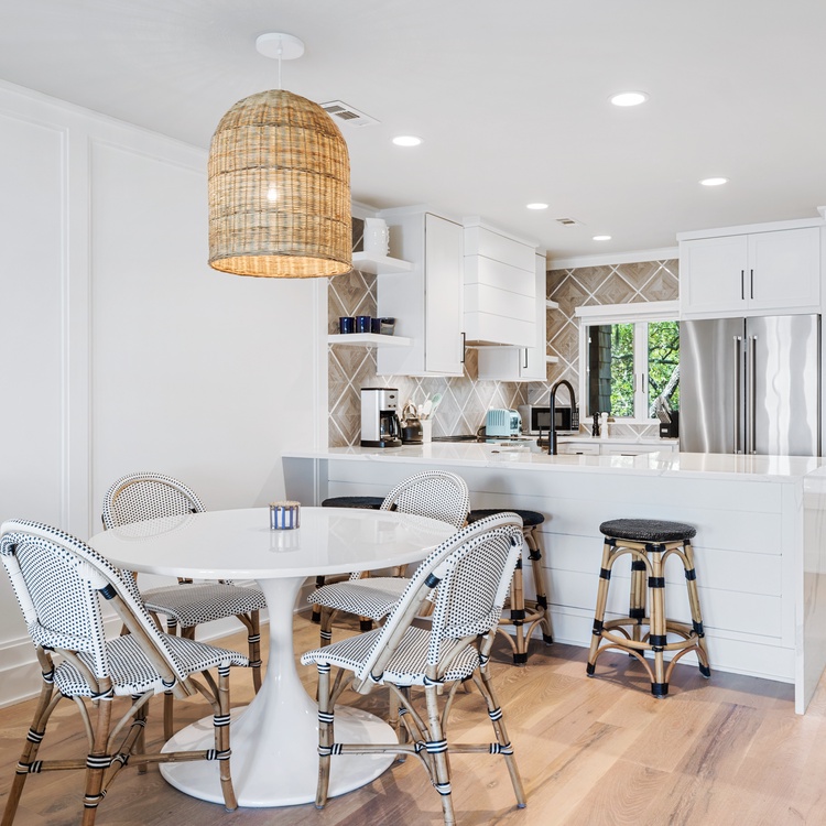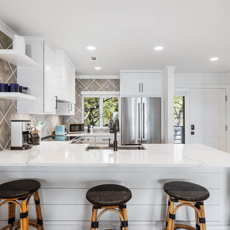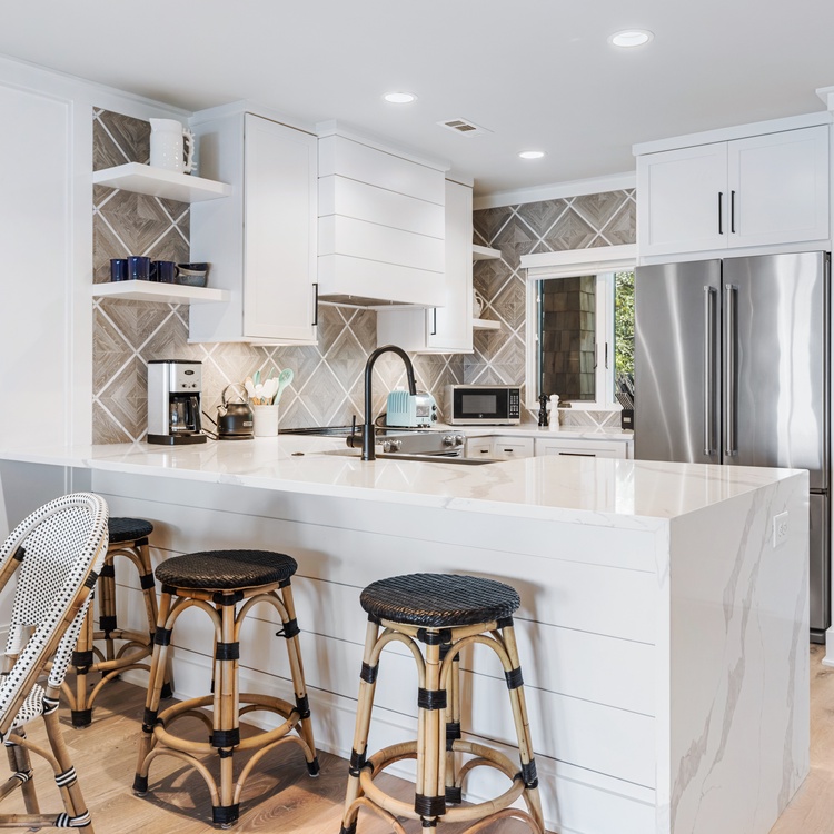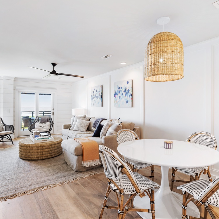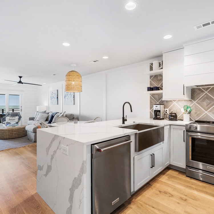 Upon entering this second-floor Windswept Villa, you will immediately notice the striking ocean views. Step into the open living space, and you will be greeted with walls wrapped in shiplap, an abundance of natural light, and stylish furnishings. Perfect for relaxing, the living area offers a comfortable L-shaped sofa and chic accent chairs surrounding a wall-mounted TV. A desk and chair nestled in the corner provide a scenic remote workstation. A dining area with a round tulip table separates the main living space from the kitchen. The villa's kitchen is beautiful and functional, with features like a farmhouse sink, custom range hood, wood-look tile backsplash, and waterfall countertop.