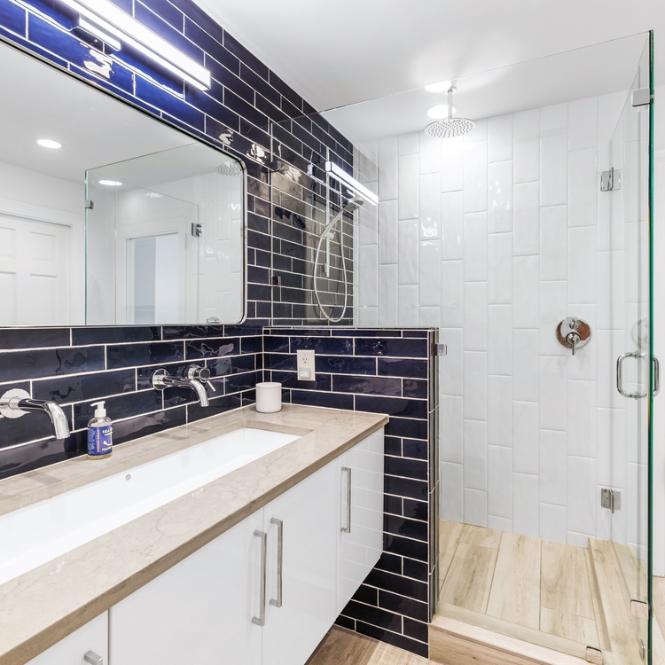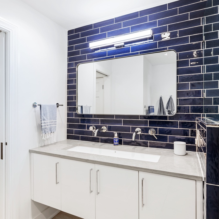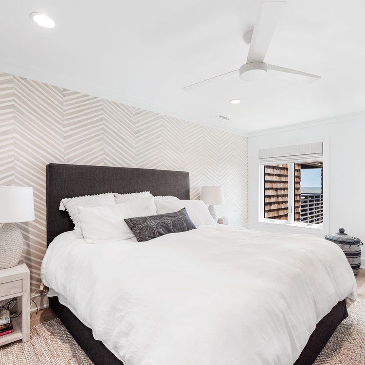 Wake up with the ocean! The villa's serene king bedroom offers views of the Atlantic, a wall-mounted TV, and a soothing neutral color palette. A full bathroom has a frameless shower, modern floating vanity, and water closet with separate vanity.