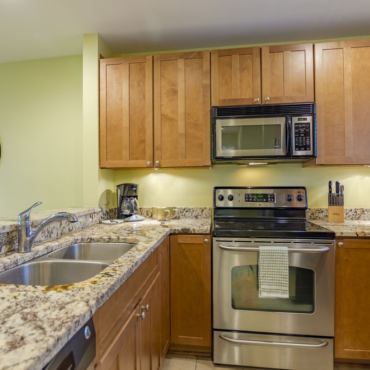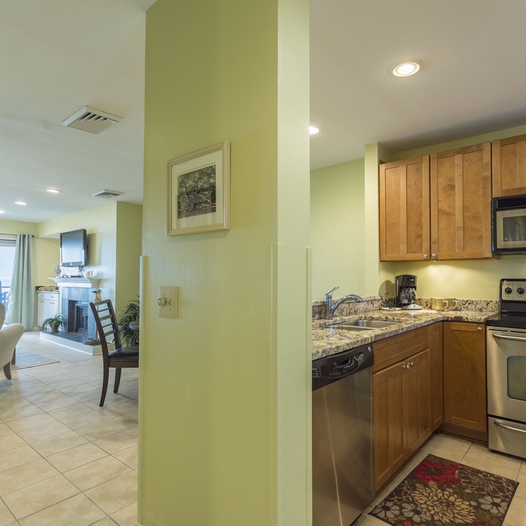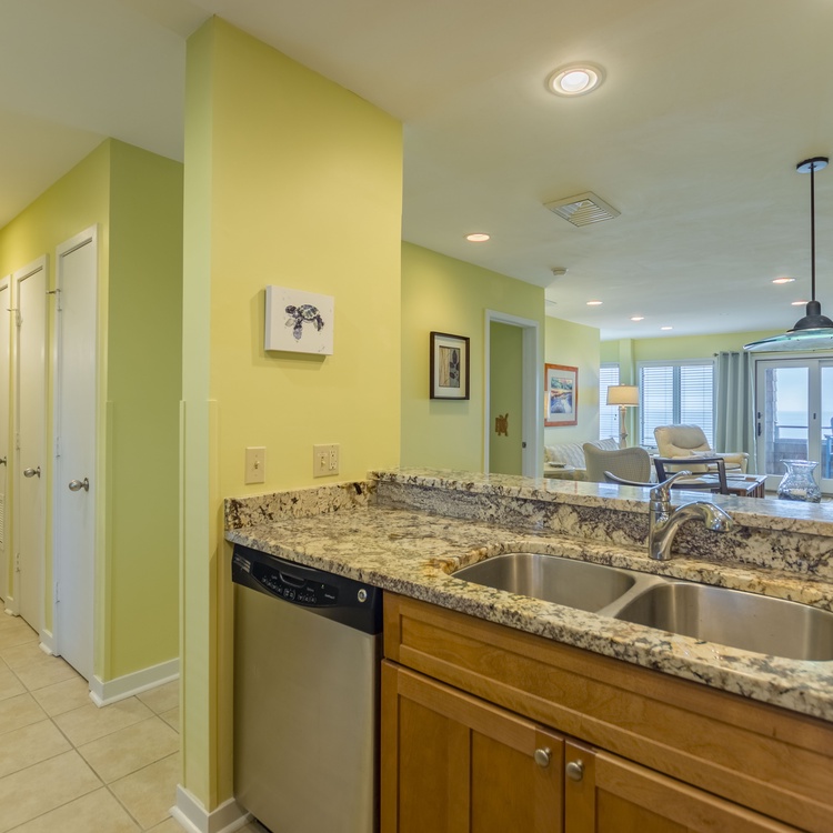 The fully equipped kitchen with granite countertops, stainless steel appliances, and nice wood cabinetry offers an open feel and views to the living area and ocean which will make preparing your meals during your stay a pleasure. The living area offers ocean views where you can sit and relax on the sofa, cozy chair, or leather recliner while watching the wall-mounted flat-screen TV with a built-in DVD player. The window seat with cushion and throw pillows makes the perfect spot for enjoying the views, sipping your morning coffee, or reading a good book. The living area also has a small bar with granite countertop and cabinet space where you can mix your favorite vacation beverages as well as a round table with four cushioned chairs for dining. Sliding doors lead from the living area to a small balcony with two chairs and a side table where you can watch the waves roll in and soak in the sunshine.