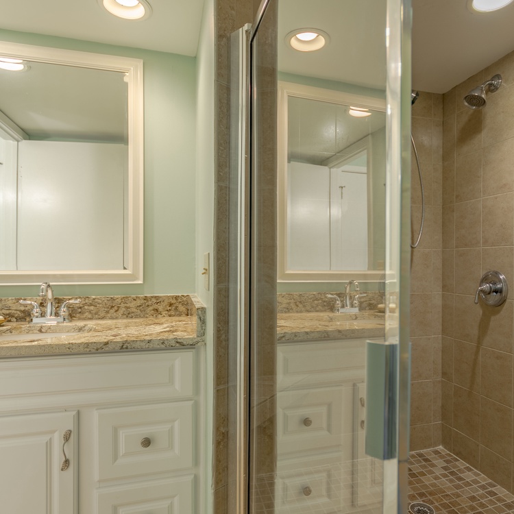 The primary bedroom has amazing ocean views, a king bed with a wicker headboard and elite pillow top mattress, a reading chair, and a wall-mounted TV. The bathroom, which you can access from the bedroom and the hallway, has been refinished with new sinks, granite countertops, a large tiled shower with a hand held spray and regular shower head and two corner seats.