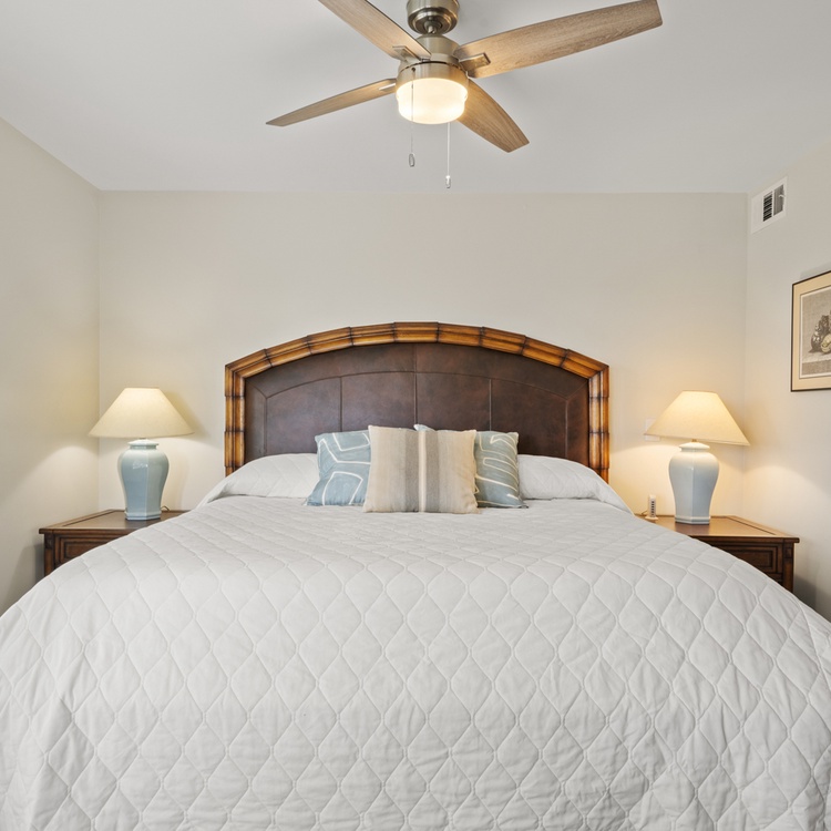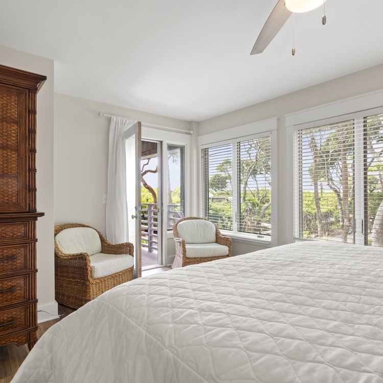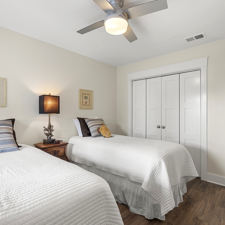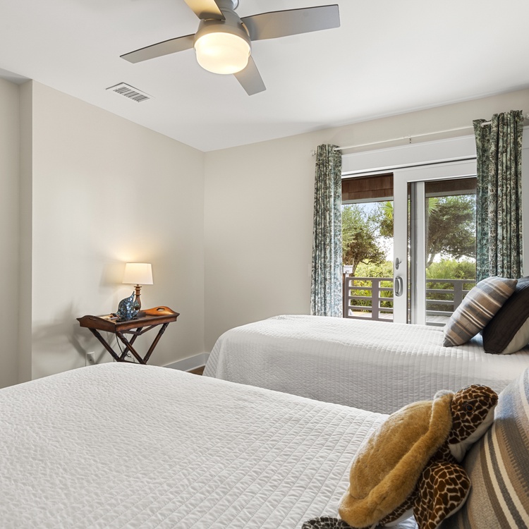 The primary bedroom offers a king bed, access to the villa’s spacious back deck, and an ensuite bathroom complete with double sinks and a walk-in shower. The charming second bedroom also offers a king bed and access to the deck. You’ll also find this bedroom offers an attached full bathroom with a walk-in shower. A covered deck has shared access from both the primary and second bedrooms. The third bedroom showcases two twin beds with a full bathroom that also has access from the hall.