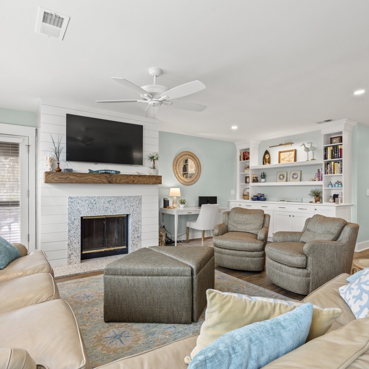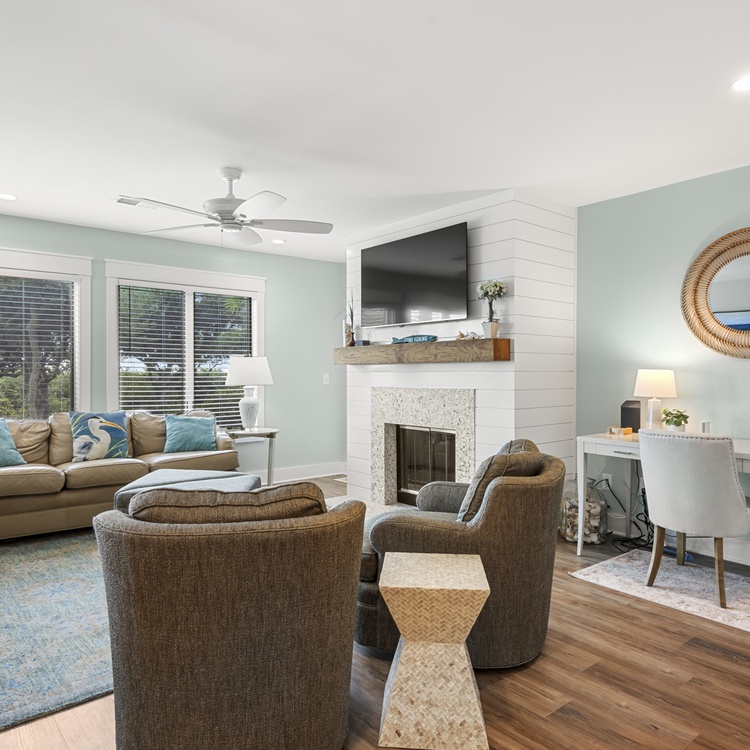 The updated kitchen features stainless steel appliances and a beautiful coastal color scheme. A dining area is located just off the kitchen and is able to seat six. Heading into the living area, guests will find plenty of comfortable seating to relax and watch TV or cozy up with a good book. Should you find yourself needing to get any work done during your getaway, a small desk/workspace is available just off to the side.