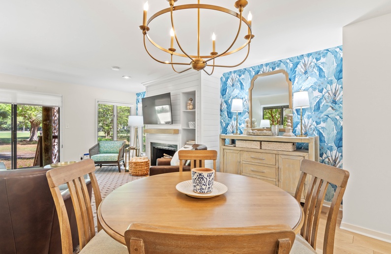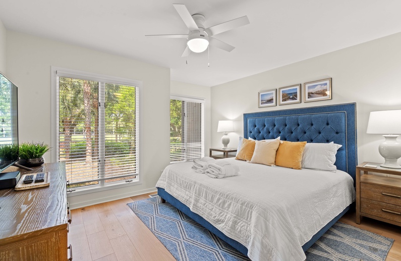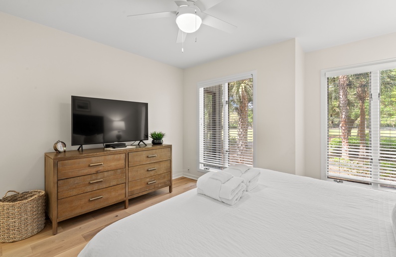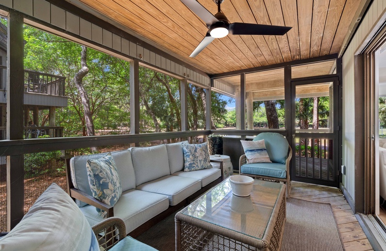 Upon entering this first-floor villa, you will find comfortable seating, a large wall-mounted flat-screen TV, and access to the deck and screened porch. The fully equipped kitchen offers white cabinetry, ample counter space, and close proximity to the dining area. The dining area offers ample seating for your whole party with scenic views.