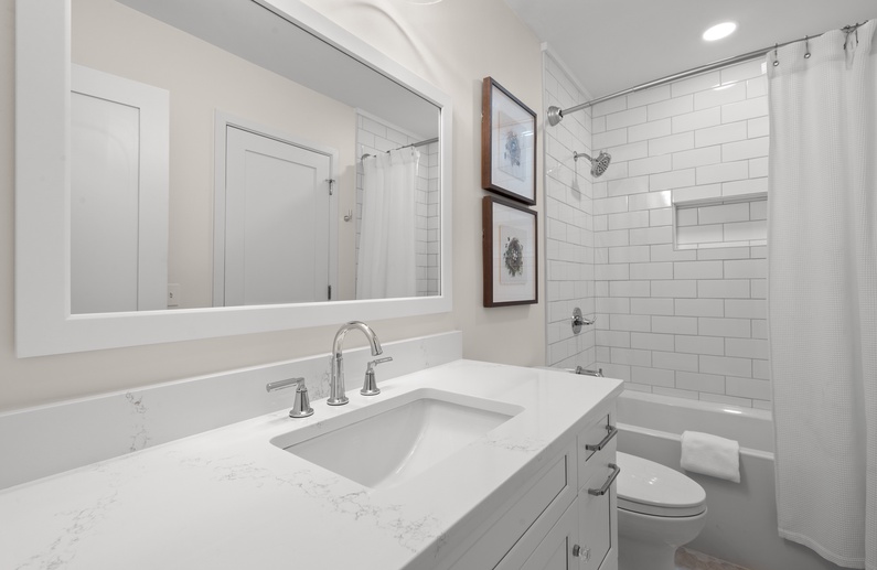 The primary bedroom features a king-sized bed, a TV, and a private primary bathroom with a shower and bathtub combination. The secondary bedroom also features a king-sized bed and a TV. The secondary bathroom offers a shower and bathtub combination and is accessible from the hall.