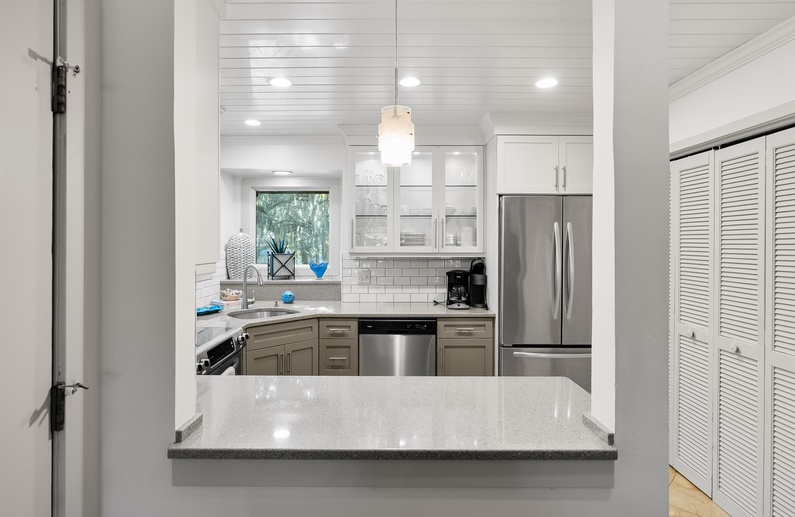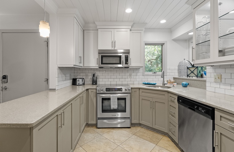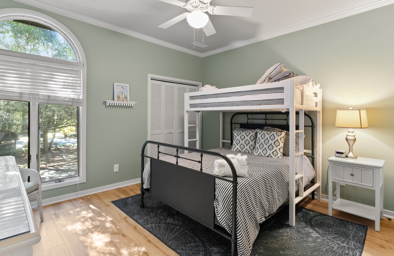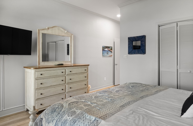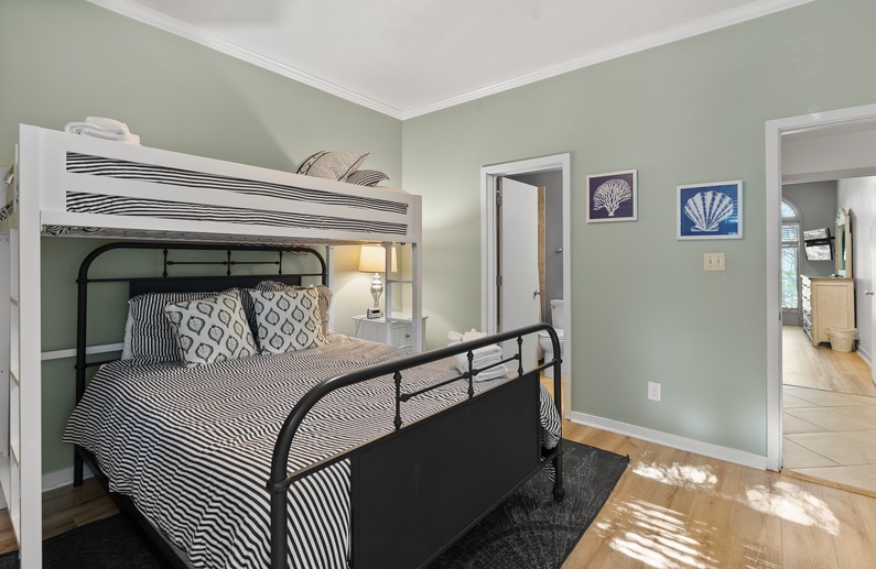 The coastal-inspired living area features a sleeper sofa, loveseat, 2 chairs, a large flat-screen TV as well as access to the deck and screened porch. The dining area offers a table and six chairs, perfect for family meals on vacation. The fully equipped kitchen features stainless steel appliances, white subway tiles, two-tone cabinets, and has easy access to the main living space. Down a short hall are two bedrooms. The primary suite offers a king bed, TV, and private bathroom. The second bedroom features a twin over queen bunk bed, TV and private entry to the hall bathroom.