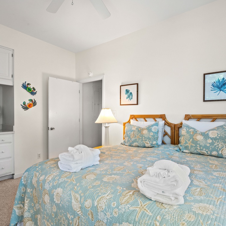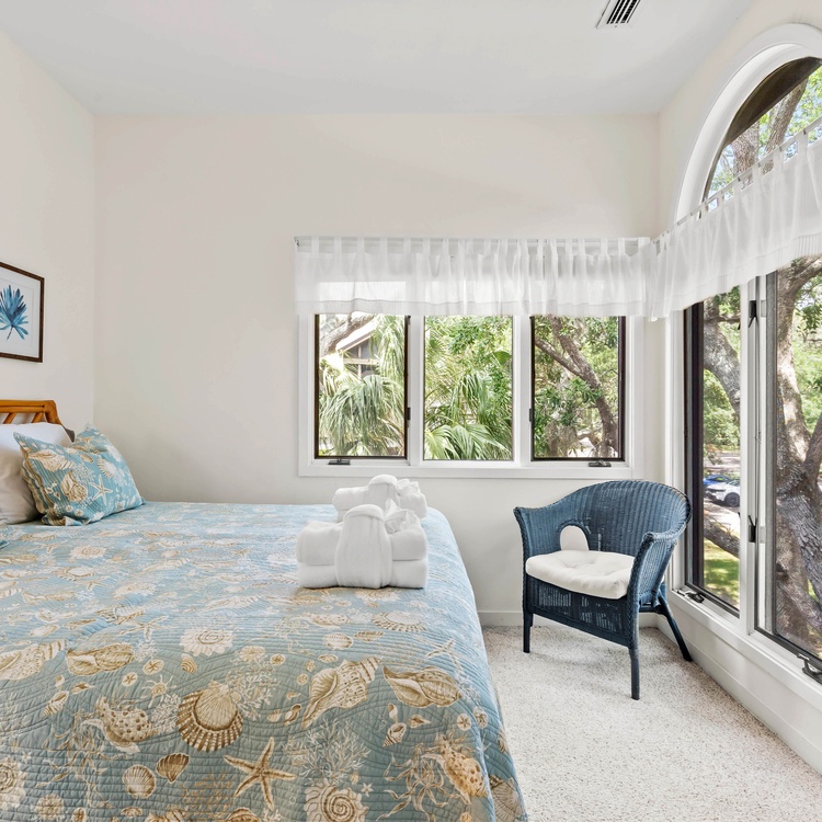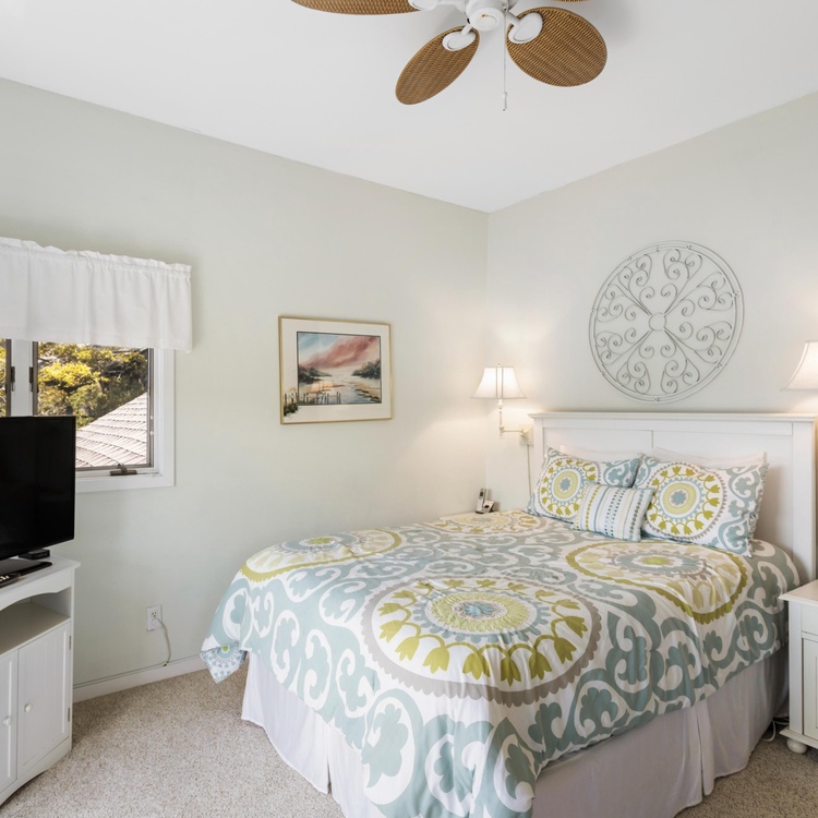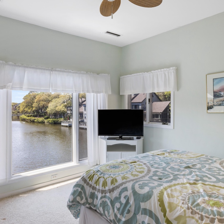 The townhouse-style villa offers a unique floor plan with a living area, full bathroom, and dock on the first floor and the main living area, bedrooms, and screened porch on the second floor. The first-floor living room offers a sleeper sofa to easily convert it into additional sleeping quarters, flat-screen TV, and access to the dock. Sitting above the lagoon, the dock provides an ideal place to lounge and soak up the sun as well as the island’s natural beauty. A full bathroom completes the first floor.