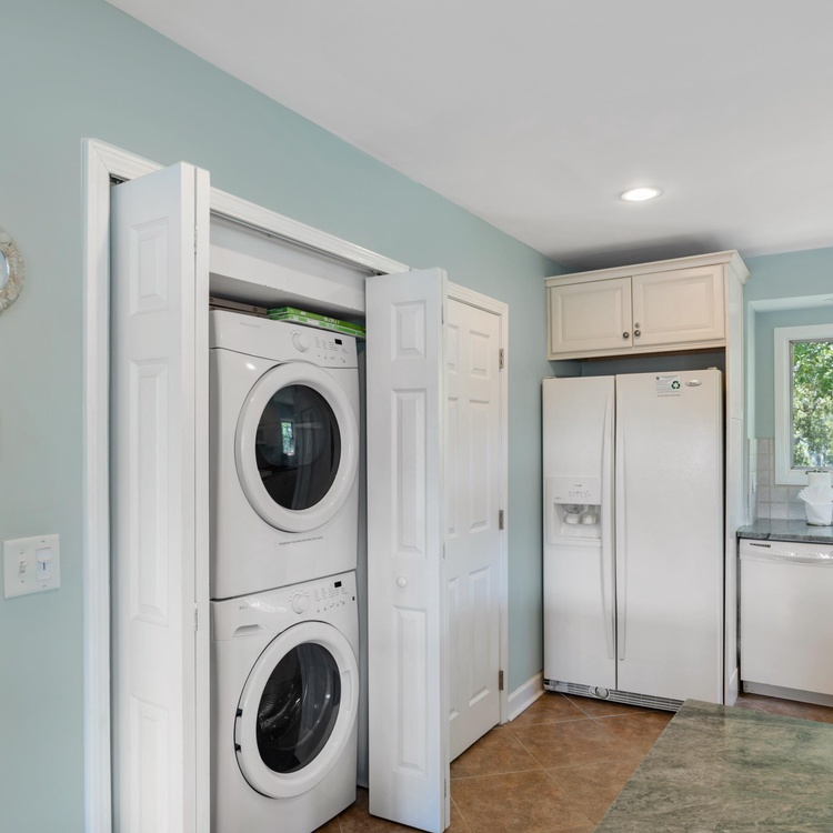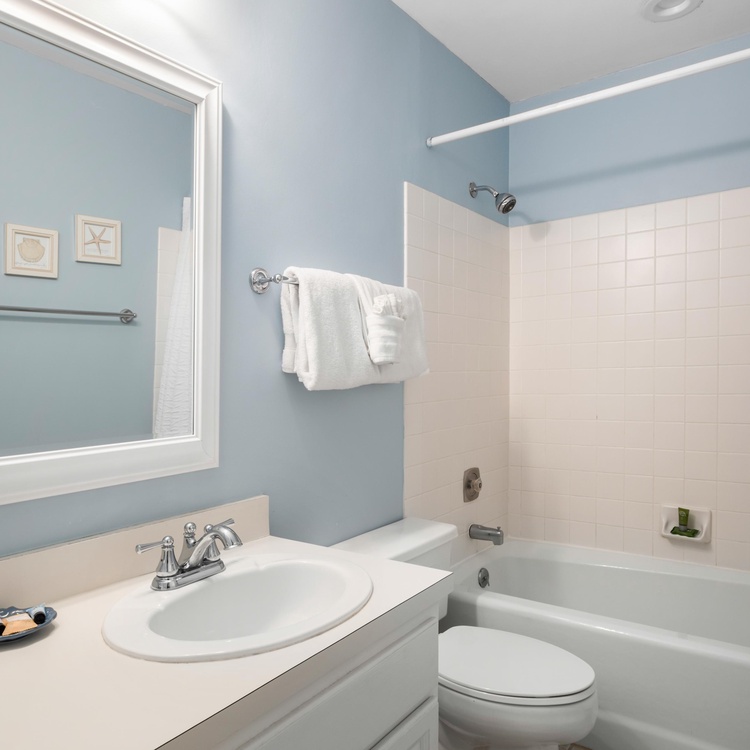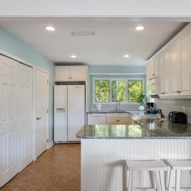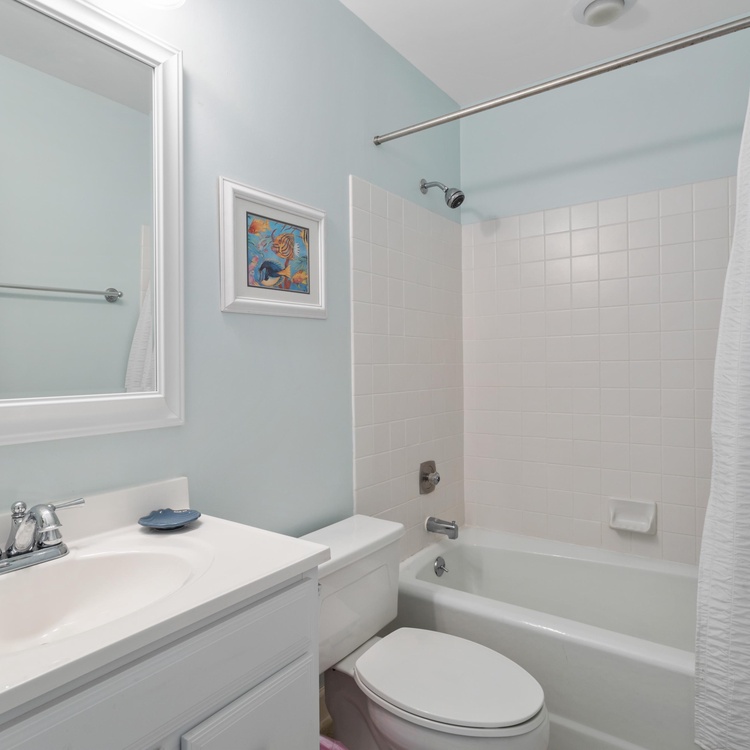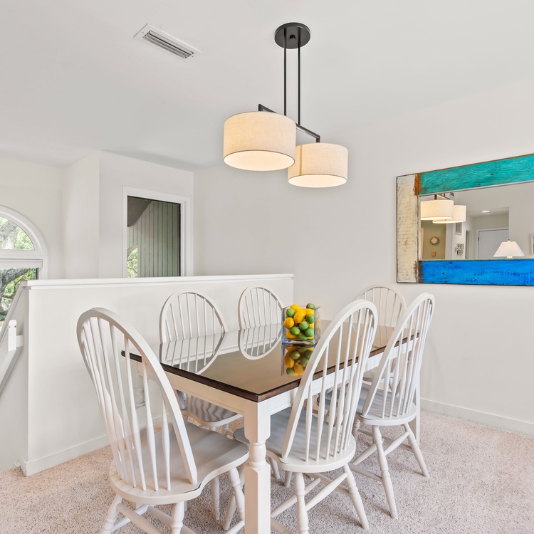 Ascend the stairs to reach the main living space and bedrooms. The dining area offers a round table with seating for six people as well as a reading corner, and the light and bright kitchen is fully equipped for preparing a variety of meals. The living room features cozy sofa and chairs, flat-screen TV, and access to the screened porch. Complete with love seat and side chairs, you will enjoy sipping your morning coffee or evening cocktail on the screened porch. The primary suite offers a queen bed, flat-screen TV, private bathroom with double sinks, and access to the screened porch. The second bedroom features a king-size bed and a flat-screen TV and uses the hall bathroom with bathtub/shower combo.