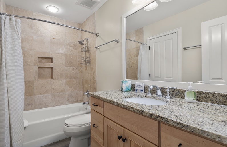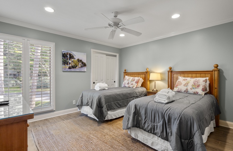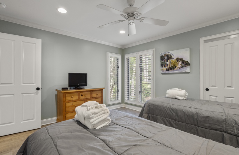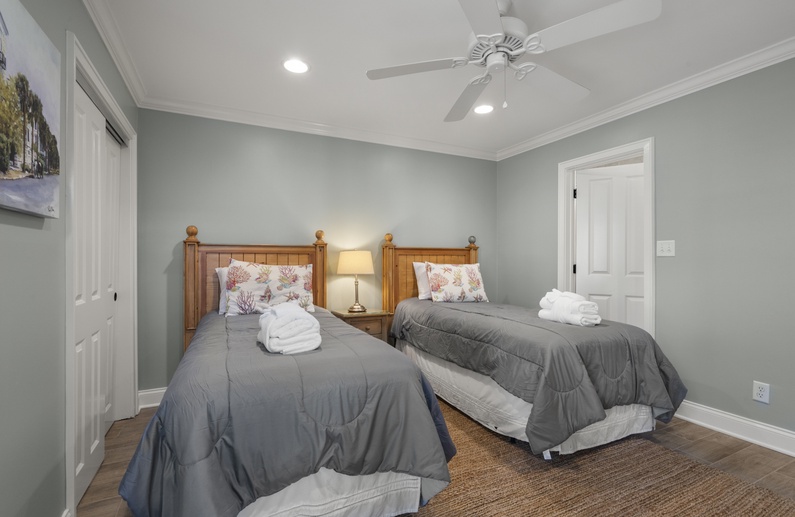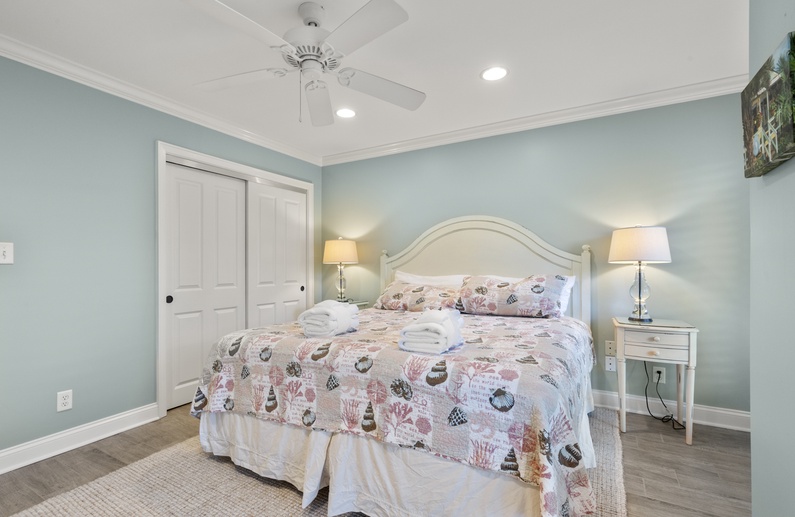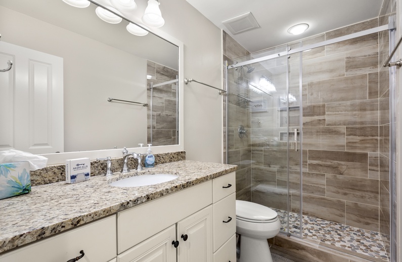 The primary suite has a king bed, chair, flat-screen TV, private bathroom with brand new shower, and relaxing lagoon views. The second bedroom offers two twin beds, flat-screen TV, and private access to the hall bathroom with bathtub/shower combination.