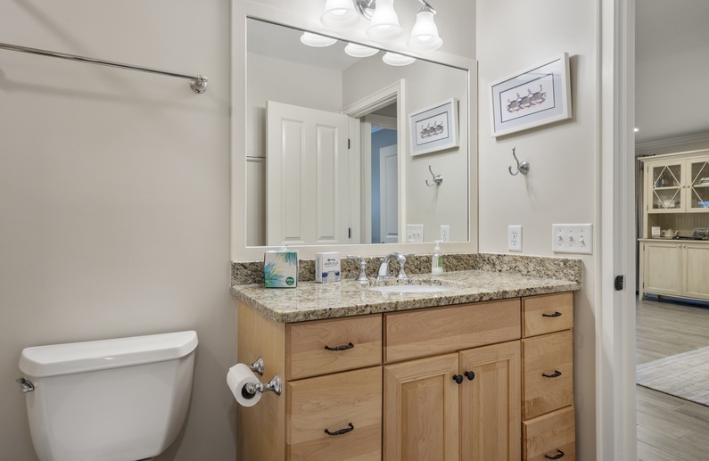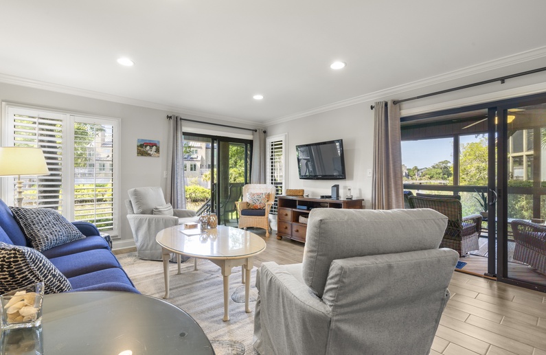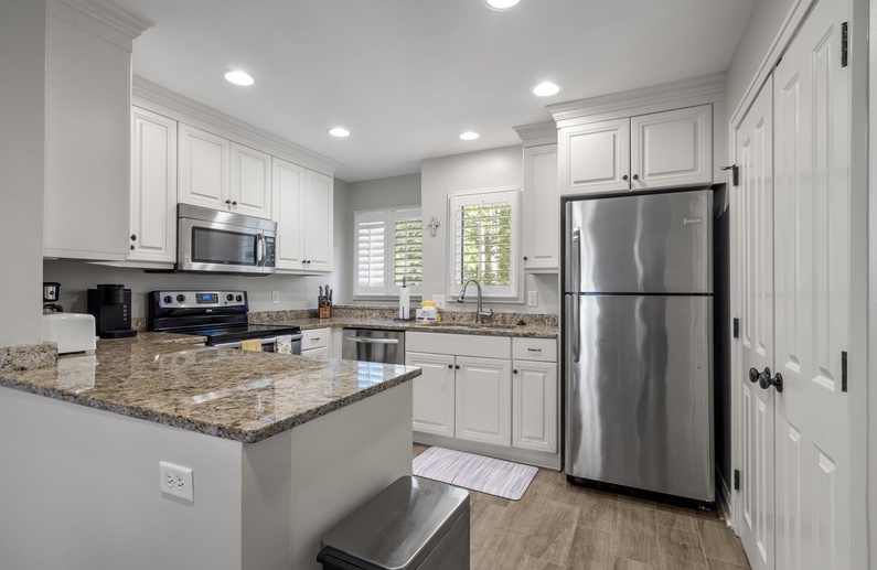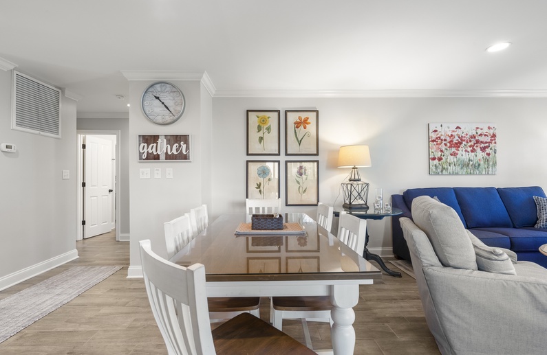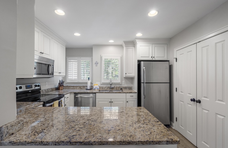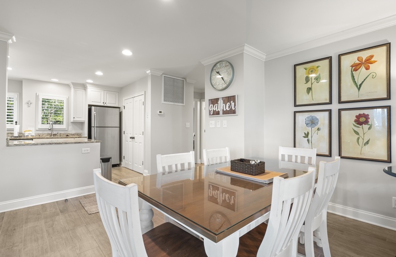 This Parkside villa has been newly renovated (2024), including new kitchen and bathrooms, ceramic tile floors, granite countertops, and crown molding. The open main living space between the kitchen, dining and living areas allows for easy meal preparation and entertaining. The comfortable living room offers cozy seating with a sofa and two gliders, side chair, floor pillows, a wall-mounted flat-screen TV, and access to the screened porch and deck. The elegant dining area seats six and connects the living room and kitchen. The kitchen showcases granite countertops, stainless steel appliances, and a large bar for serving meals.