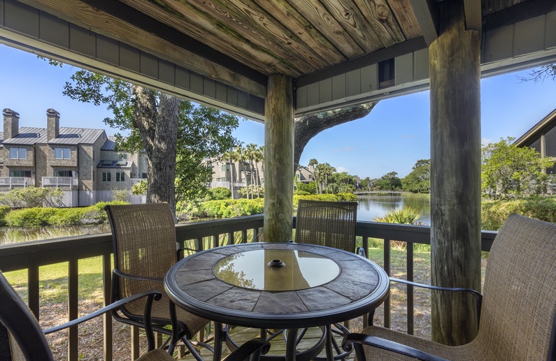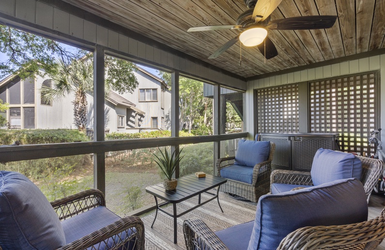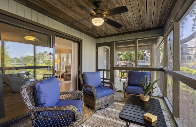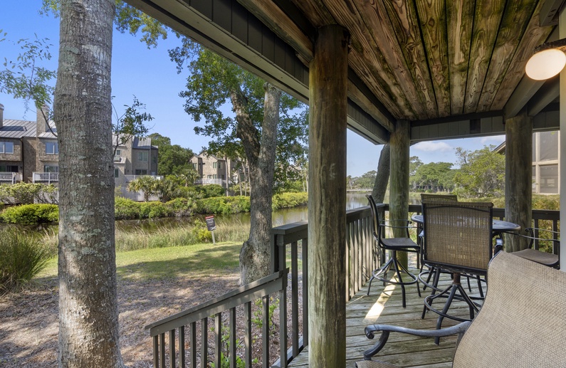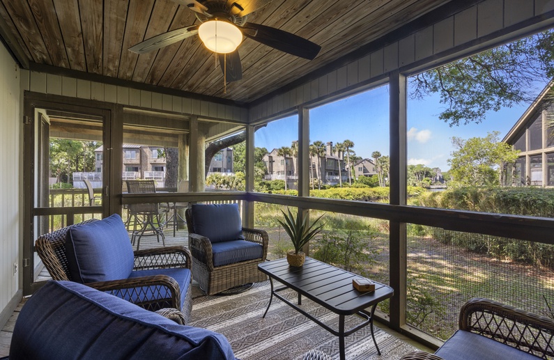 The villa boasts great outdoor space, all accessible from two sliding glass doors in the living room. The screened porch features a desirable ceiling fan and a cozy seating area. The screened porch also opens to the back deck. The deck offers a high table with four tall chairs for viewing the beautiful lagoon and island habitat.