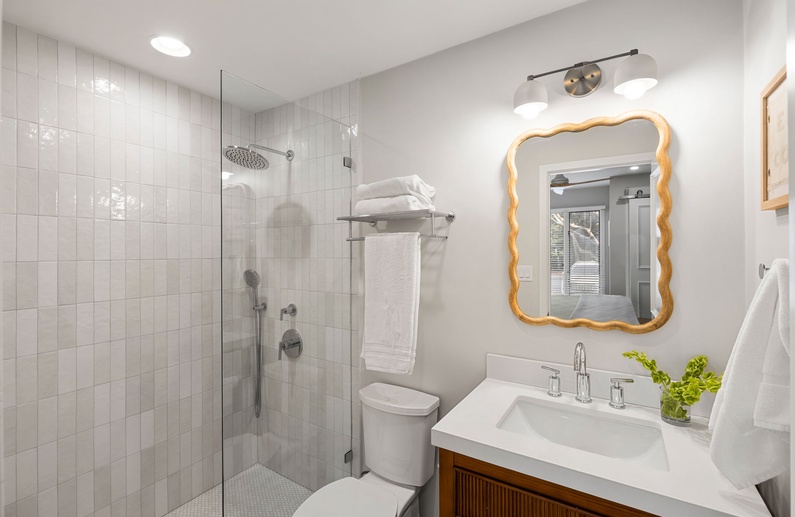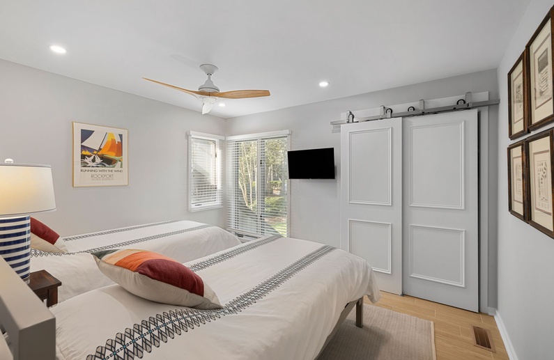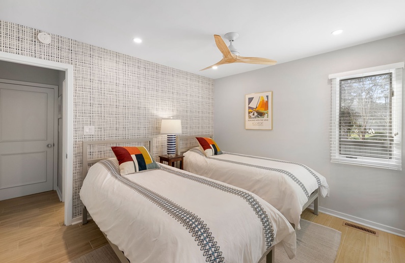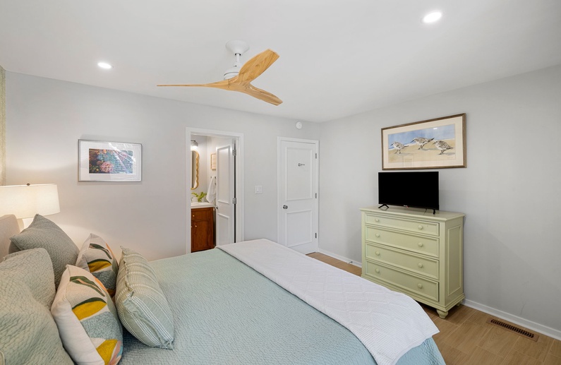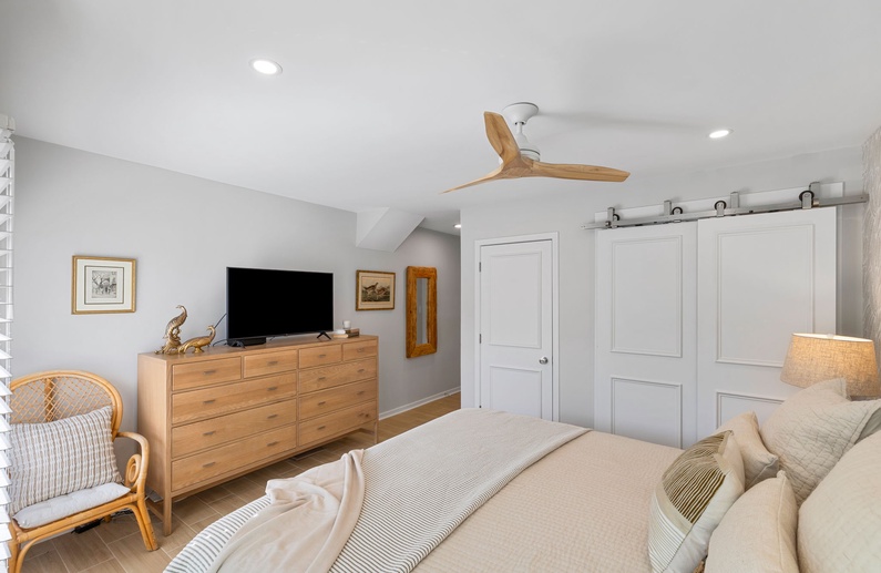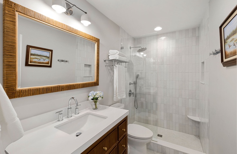 Down the hall from the kitchen - past the utility, games, and full-sized laundry closets - the primary bedroom has a spacious en-suite bath with a large walk-in shower, a king bed, a flat-screen TV with cable, and views of the lagoon. The second bedroom has an en suite bath with a large walk-in shower, a flat screen Smart TV and a king bed. The third bedroom has two twin XL (suitable for children or adults) beds, a Smart TV, and an adjacent bath with a tub/shower.