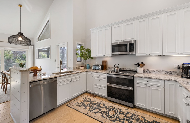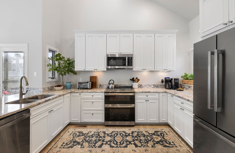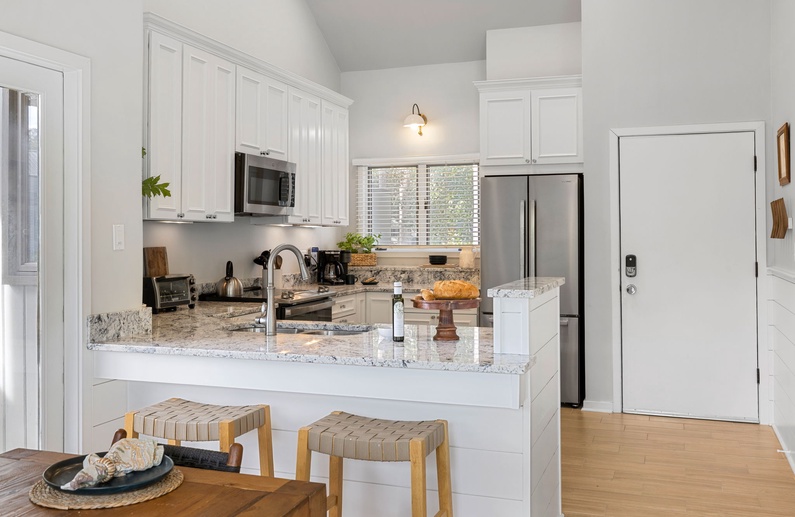 This villa features a convenient one-story, end-unit layout. Enter into the spacious, fully equipped kitchen with soaring ceilings, offering elegant white cabinetry, new stainless steel appliances, sleek granite countertops with plenty of prep space plus all of the essentials to prepare delicious meals.