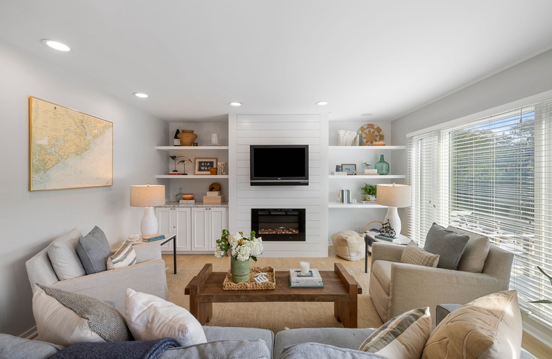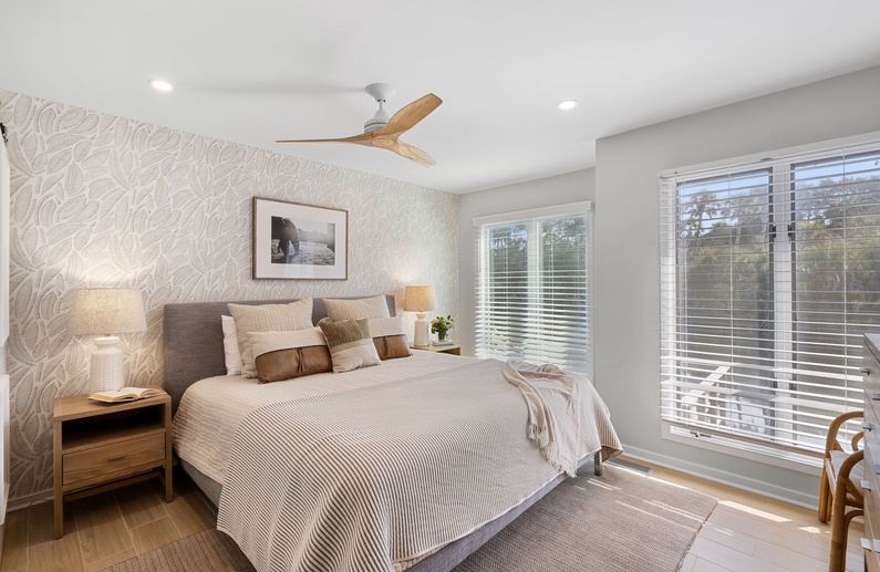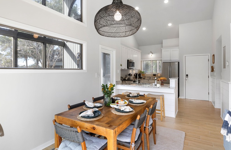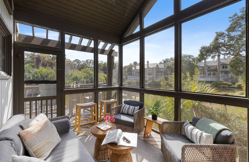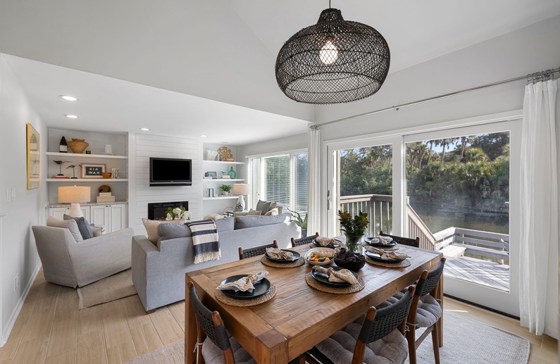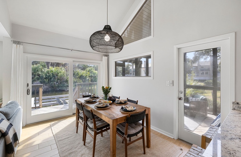 Relax in the inviting living room, featuring a cozy sofa, two comfortable swivel chairs, and a flat-screen TV with cable for your entertainment. A generous dining area between the kitchen and living rooms comfortably seats six, and leads to additional seating on the breezy screened-in porch. The private, multi-level deck and dock is accessible via sliding glass doors off the open-concept main living space and also via the screen porch, allowing for excellent flow and room to spread out. Take in the serene beauty of the lagoon while you sip your morning coffee al fresco - you will find yourself immersed in all of the breathtaking nature that Kiawah Island has to offer.