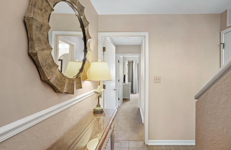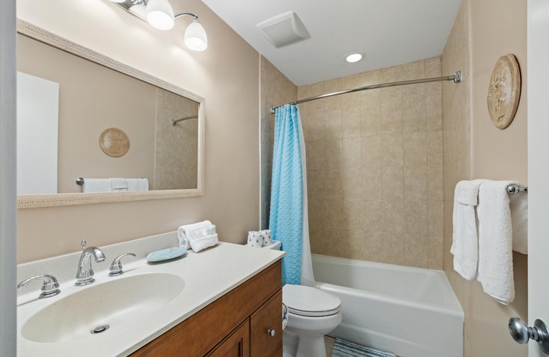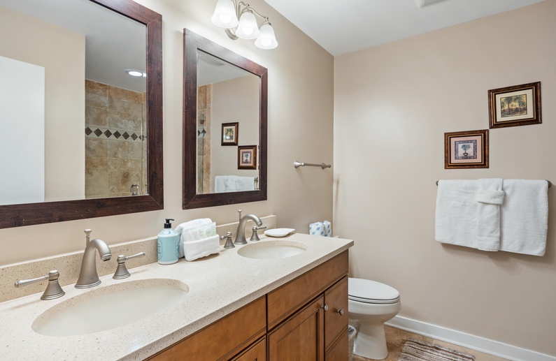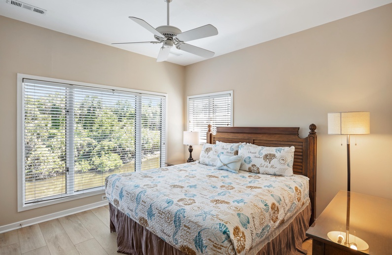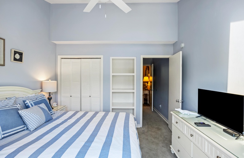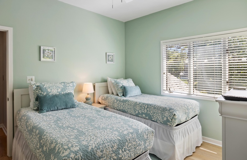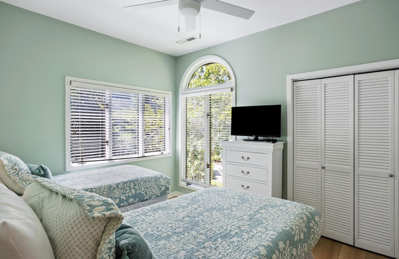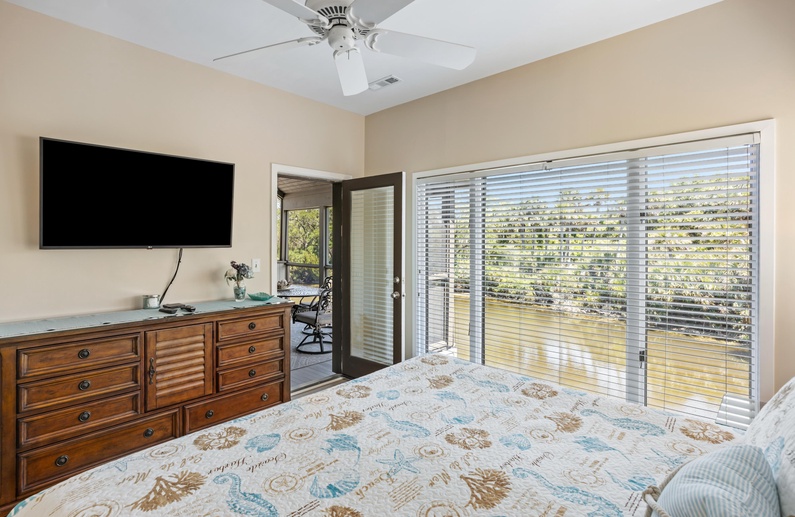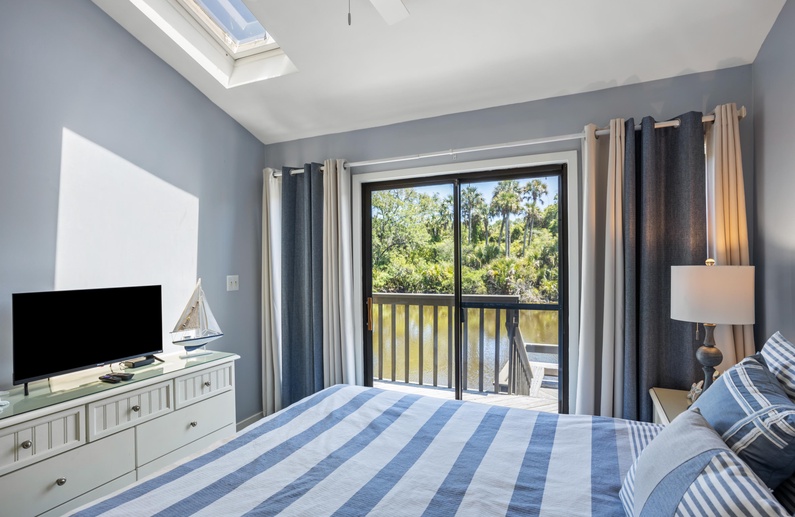Two of the three bedrooms are found on the second floor. The lagoon view primary suite features a king-sized bed, flat-screen TV, private bathroom with double sinks and a large shower, and easy access to the screened porch. The second upstairs bedroom offers two twin beds, a flat-screen TV, and bathroom with shower/tub combination. Downstairs you will find the third bedroom, which has a lovely lagoon view, queen-sized bed, flat-screen TV, and access to the deck and dock. The attached bathroom has a shower/tub combination.
