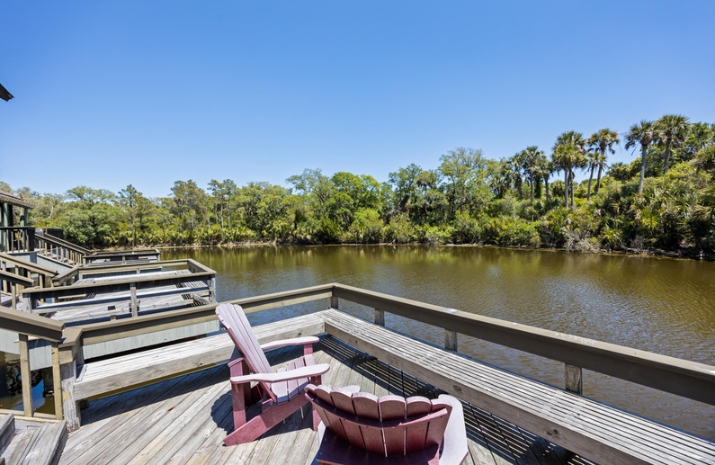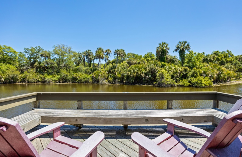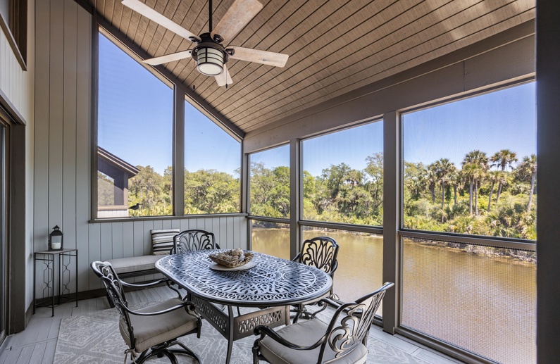 The villa features two incredible outdoor spaces with lagoon views: the first floor provides access to the dock and the second floor offers a screened porch. The dock features wraparound bench seating and two chaise lounges. The screened porch has an elevated ceiling, desirable ceiling fan, dining table with six chairs, and two additional cozy chairs. This villa provides ample space to relax with family and friends and abundant opportunities to enjoy the lagoon and surrounding island habitat.