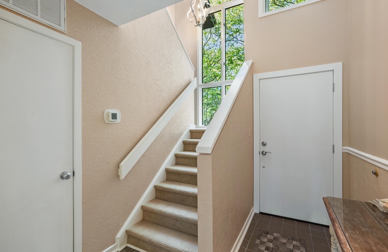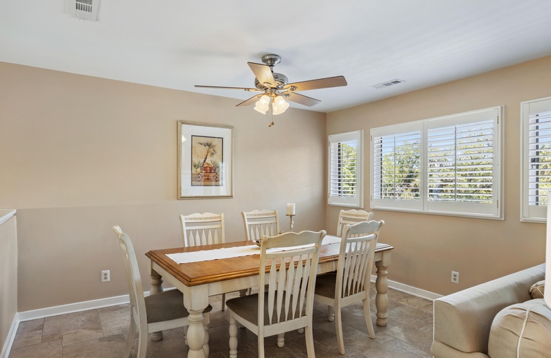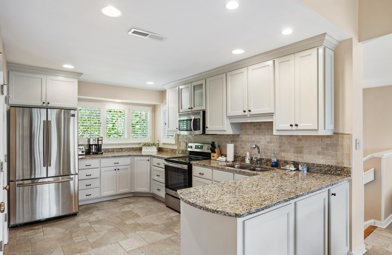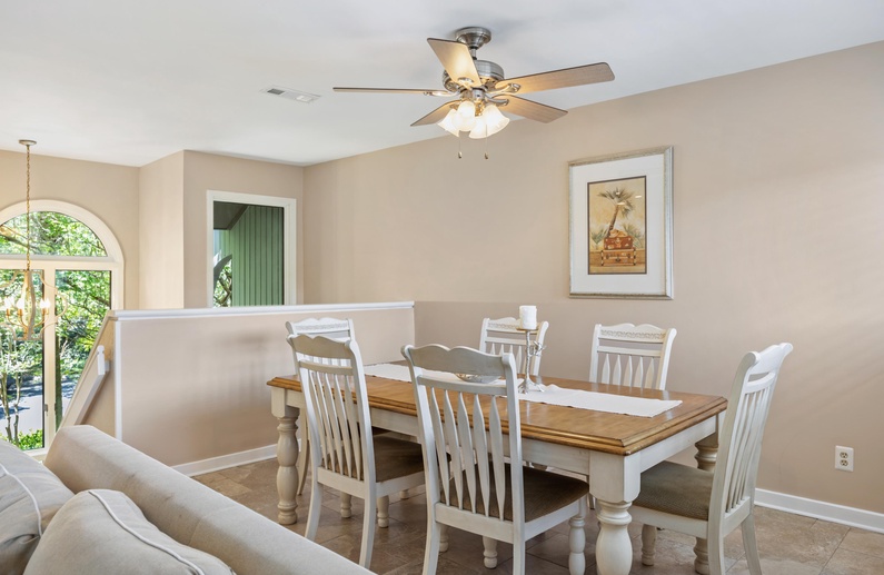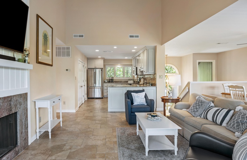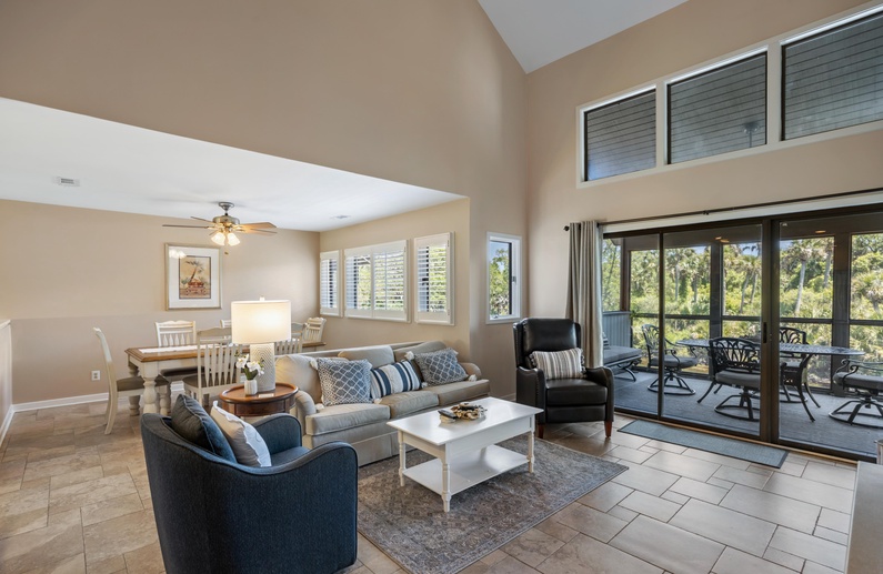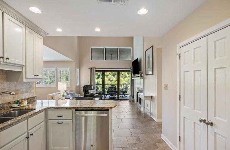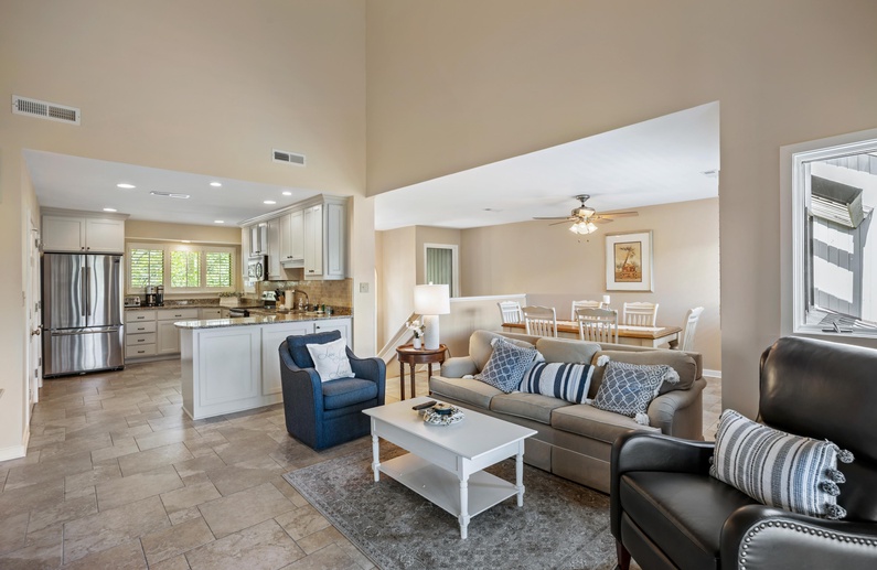 This beautifully renovated villa offers a two-story townhouse layout with the main living areas on the second floor. The open floor plan allows for easy meal preparation and entertaining during your stay. The large updated kitchen features granite countertops, a beautiful tile backsplash, and stainless steel appliances, including a new french-door refrigerator. The dining area offers a table with seating for six. The comfortable living room, with new furnishings, showcases an elevated ceiling, plenty of seating with a sofa, cozy side chair, and leather recliner, wall-mounted flat-screen TV, and access to the screened porch.