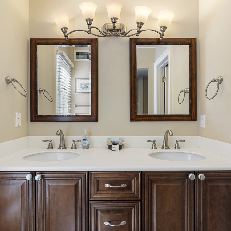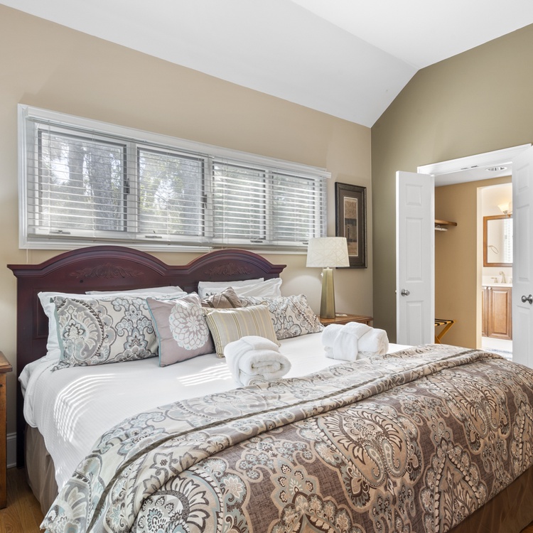 The primary bedroom features a king-sized bed, a TV (streaming only), and a private bathroom with a double sink vanity and a shower and bathtub combination.