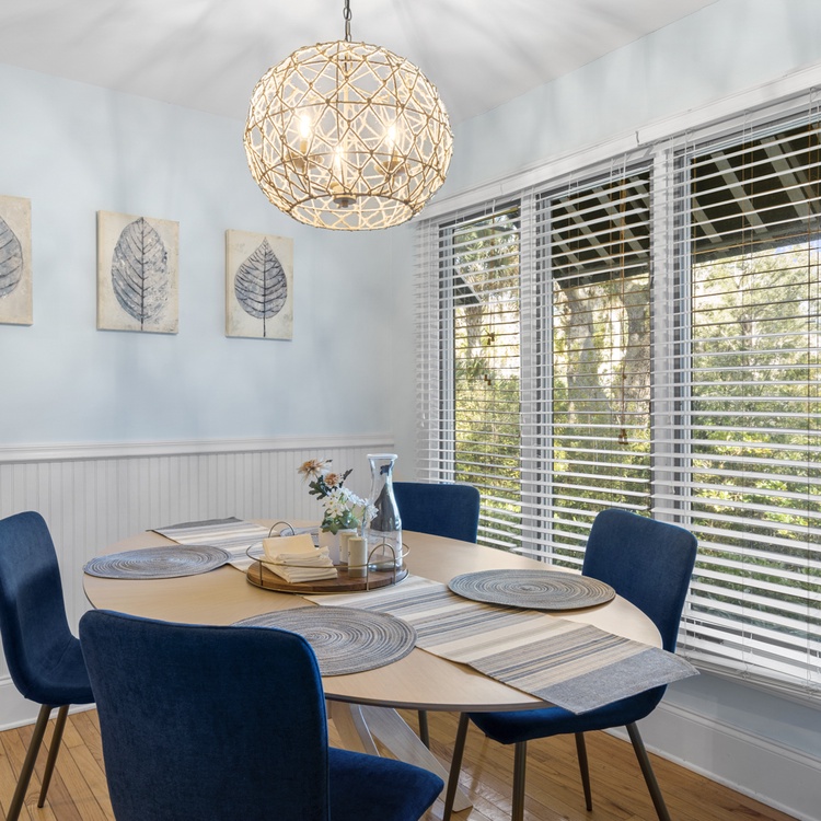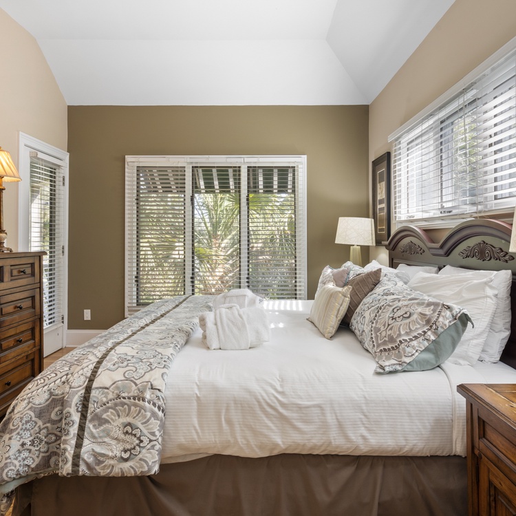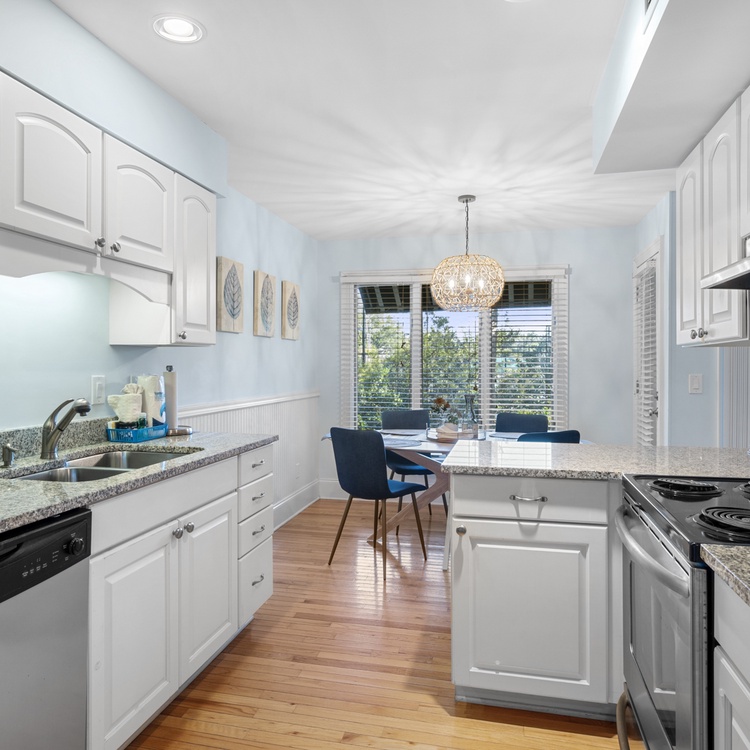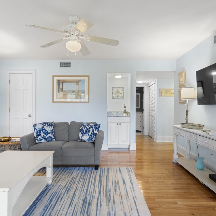 This first-floor Tennis Club Villa features a one-story layout with ample natural light and beautiful hardwood flooring. In the living area, you will find comfortable seating, a flat-screen TV, and views of the Roy Barth Tennis Courts. The fully equipped kitchen opens to the dining area and provides ample counter space to prepare your vacation meals. The cozy dining area serves as the perfect entertainment space as it offers tennis views, ample seating, and close proximity to the kitchen.
