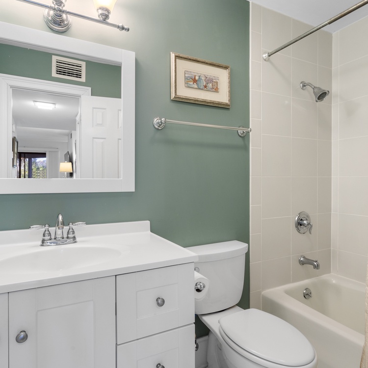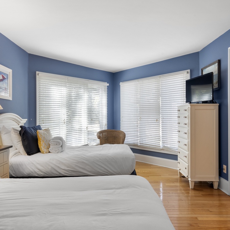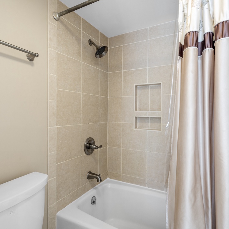 The secondary bedroom is perfect for kids as it offers 2 twin-sized beds, a TV, and a secondary bathroom that is also accessible from the hall. The secondary bathroom also features a shower and bathtub combination.