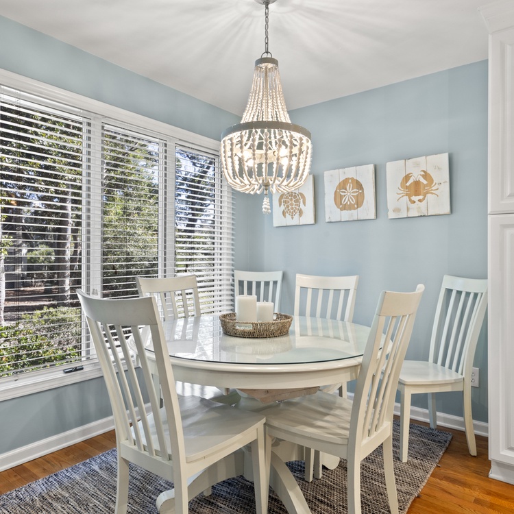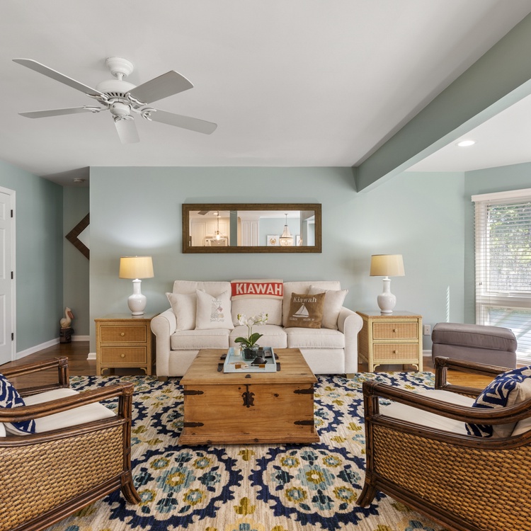 This updated Kiawah Island vacation rental offers two bedrooms, a sunroom, and is about a 10 minute walk to the beach.