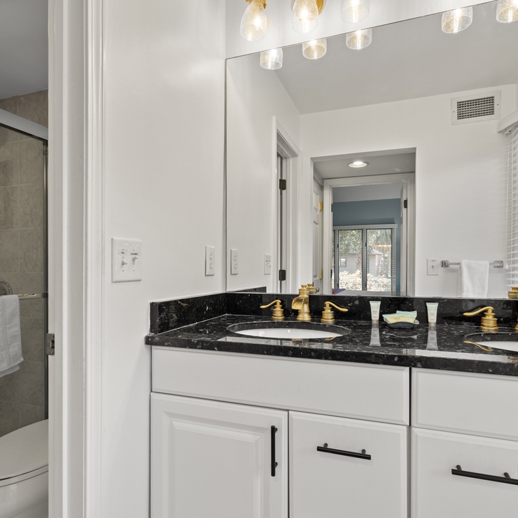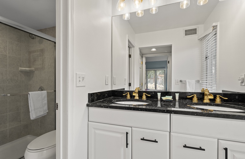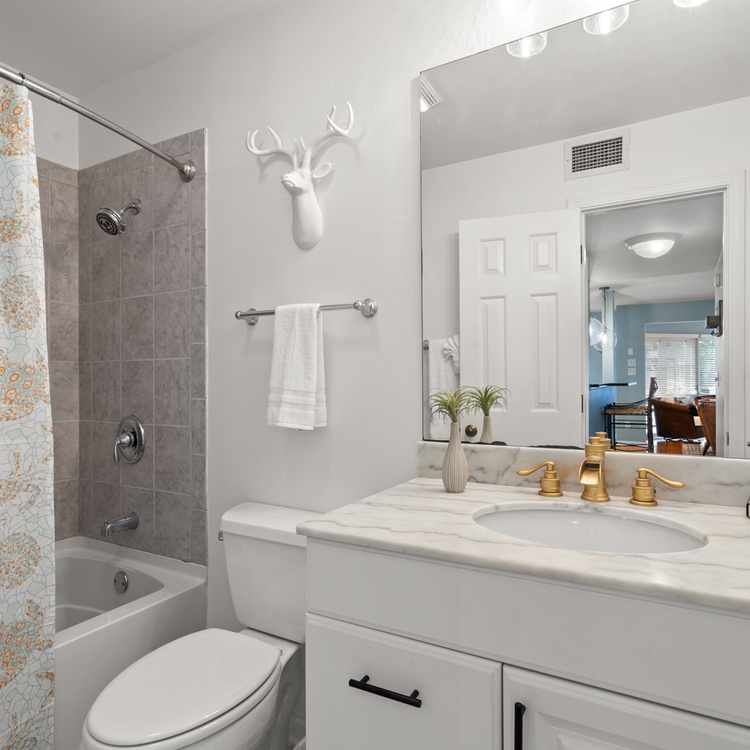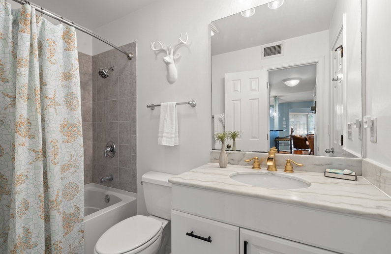 The primary suite features a king bed, flat-screen TV, and private bathroom with shower. The second bedroom provides two full beds, flat-screen TV, and access to the hall bathroom with bathtub/shower combo.
