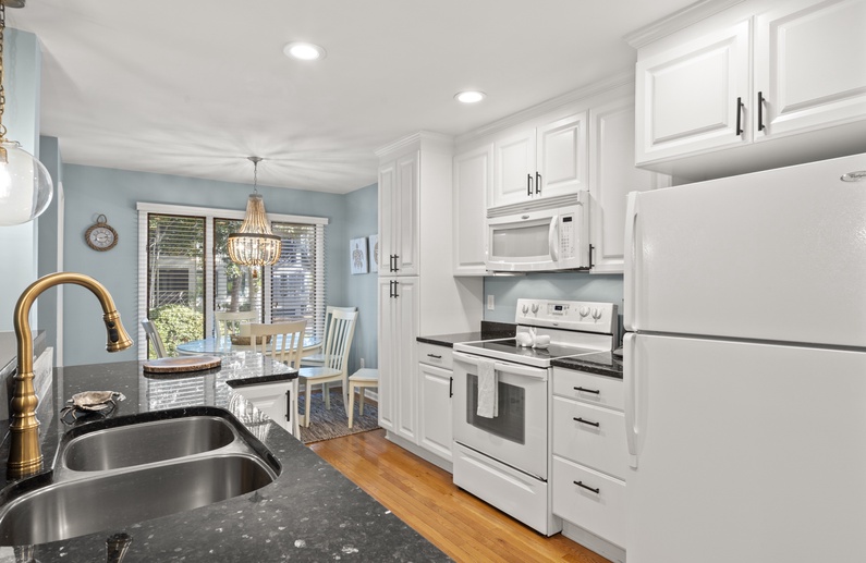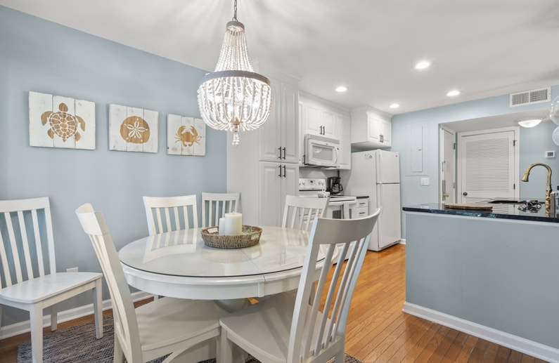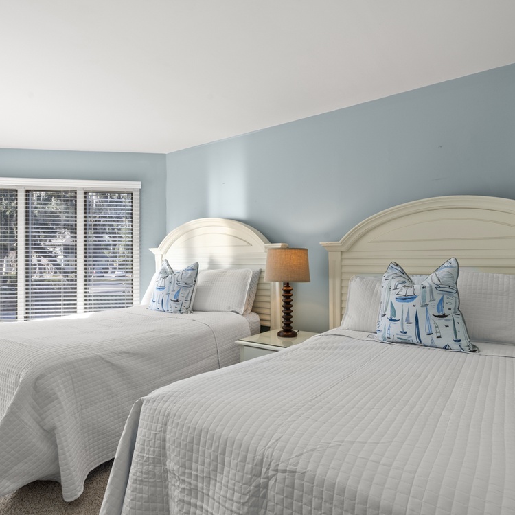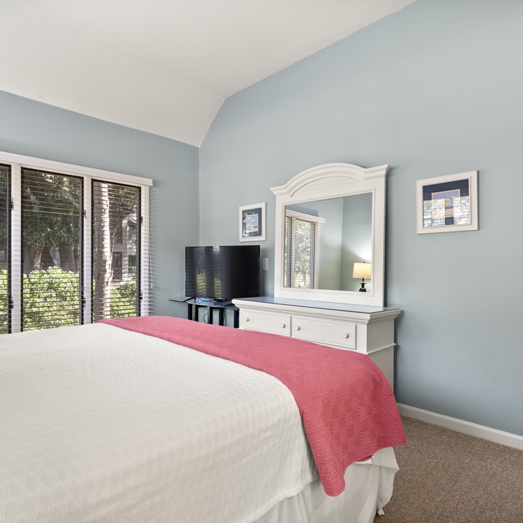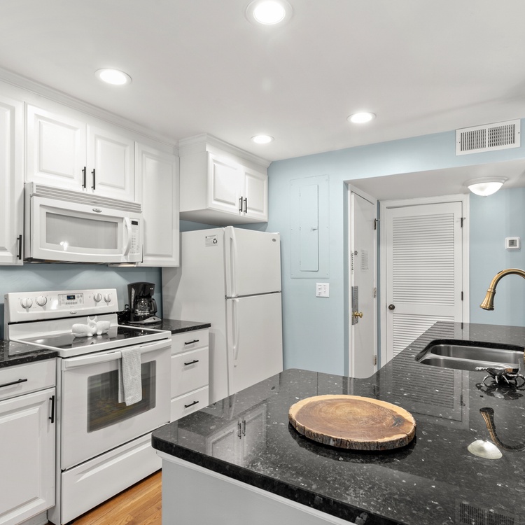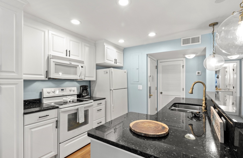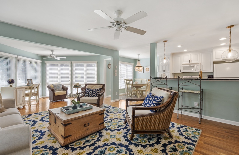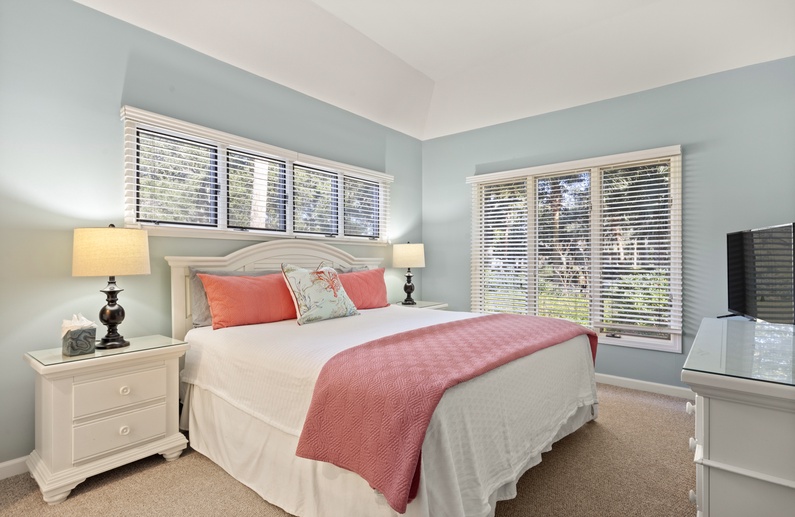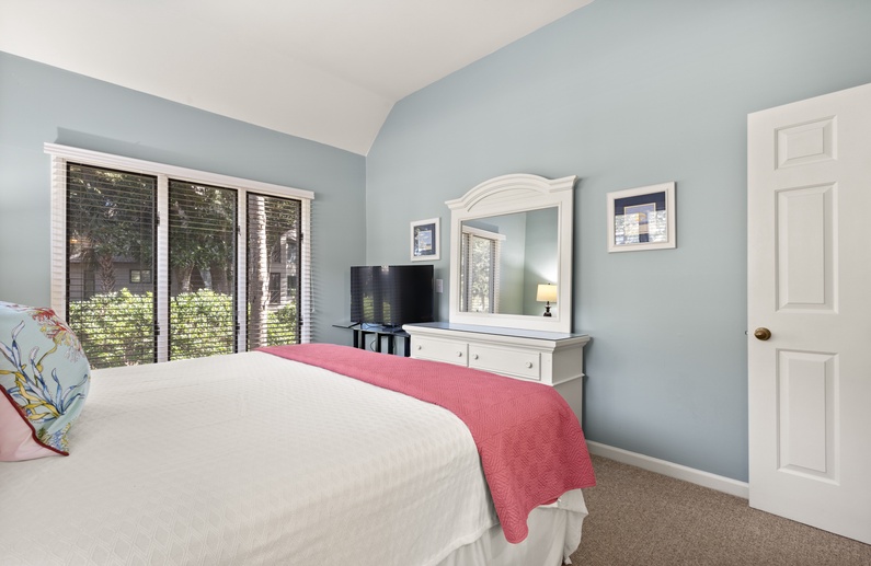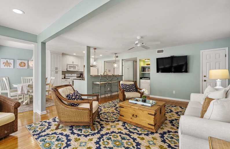 This first-floor Tennis Club Villa has been beautifully renovated to open up the kitchen and living room as well as convert the screened porch into a sunroom. The serene colors and well-appointed furnishings nicely complement the villa’s coastal location. The light-filled living room features a queen sleeper sofa, two accent chairs, and a wall-mounted flat-screen TV. The sunroom provides a cozy sitting area as well as a desk and chair for anyone needing to do a little work while on vacation. The fully equipped kitchen offers a bar with two stools, white cabinetry and appliances against dark granite countertops, and a dining area.