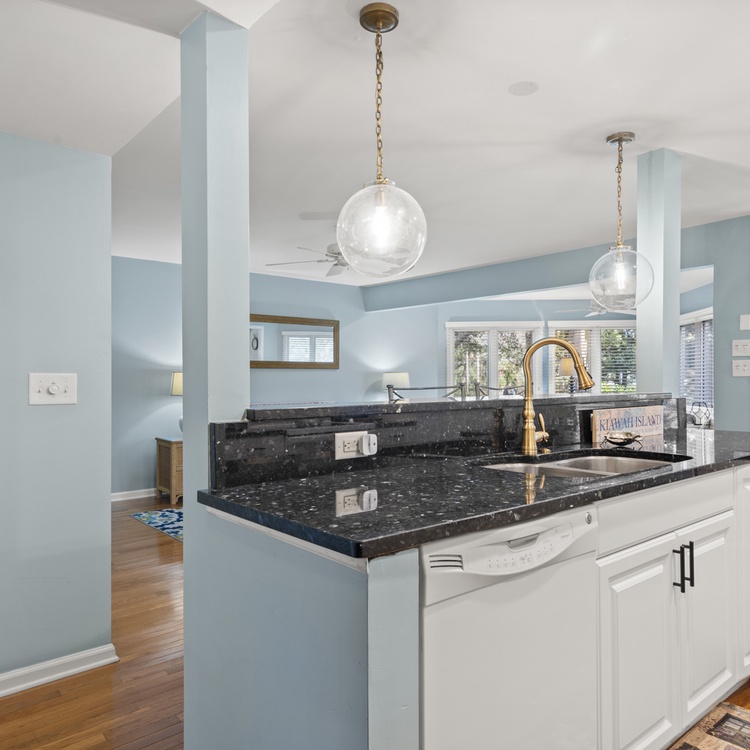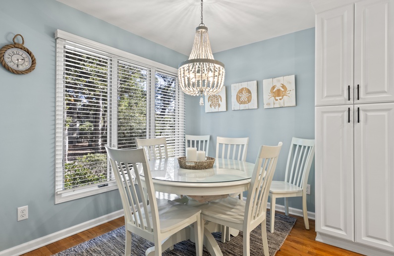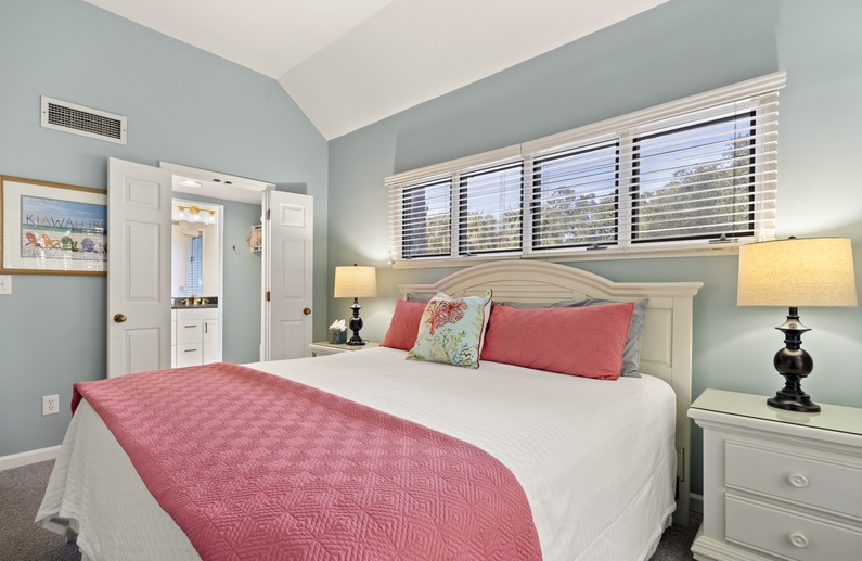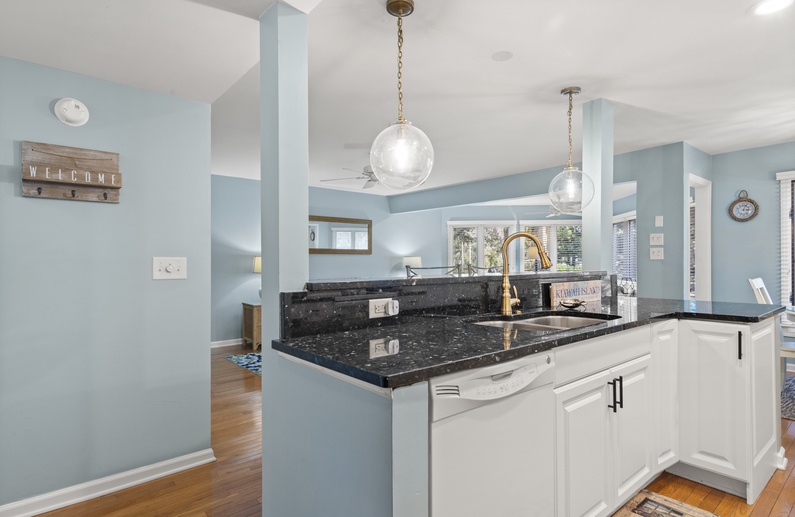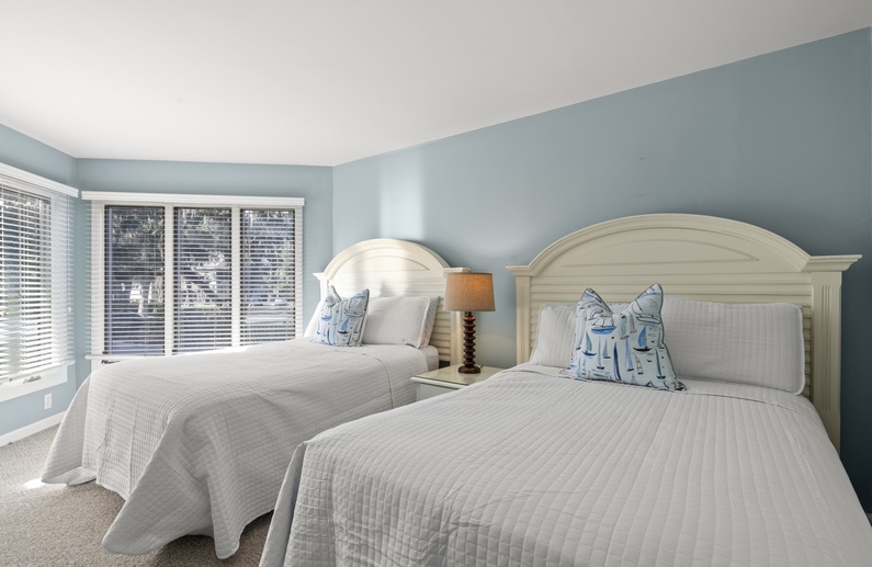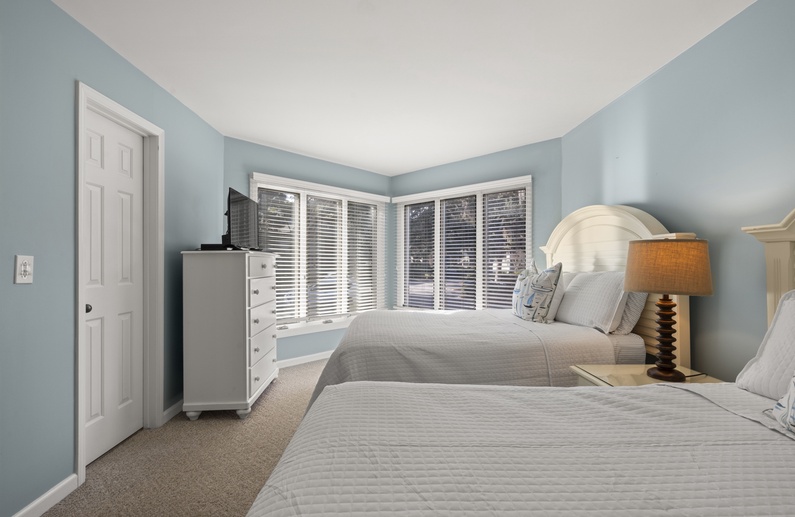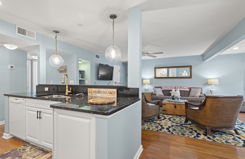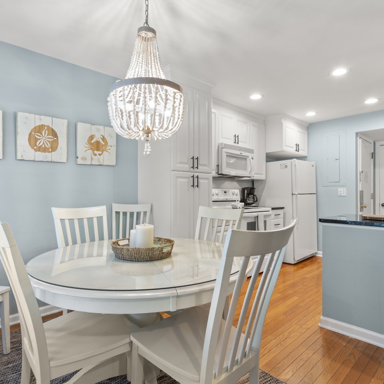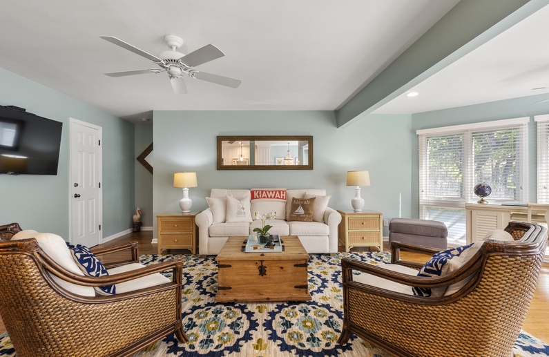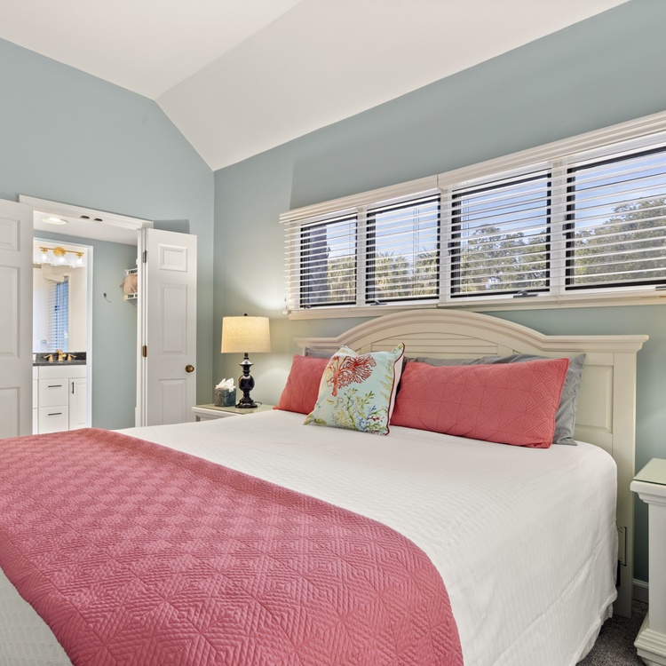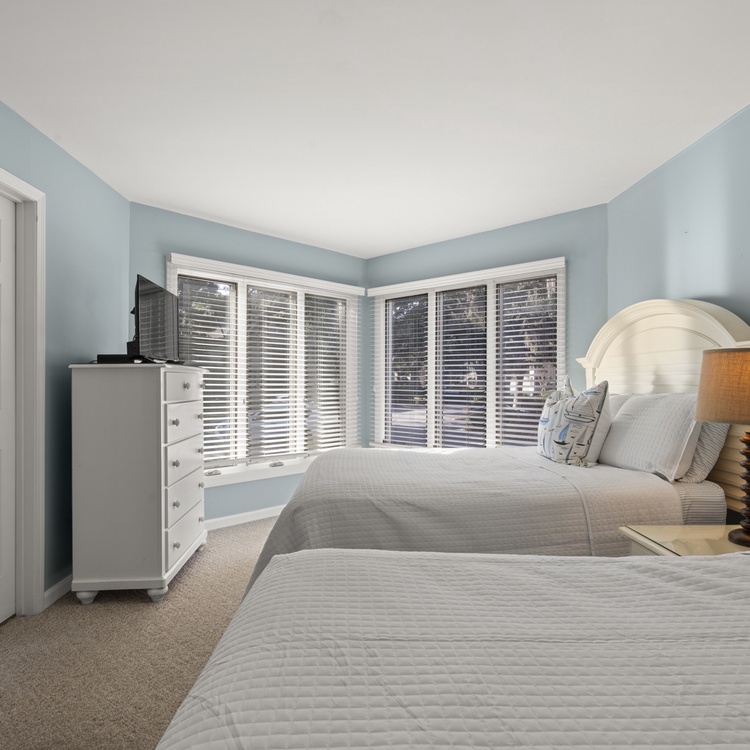 This first-floor Tennis Club Villa has been beautifully renovated to open up the kitchen and living room as well as convert the screened porch into a sunroom. The serene colors and well-appointed furnishings nicely complement the villa’s coastal location. The light-filled living room features a queen sleeper sofa, two accent chairs, and a wall-mounted flat-screen TV. The sunroom provides a cozy sitting area as well as a desk and chair for anyone needing to do a little work while on vacation. The fully equipped kitchen offers a bar with two stools, white cabinetry and appliances against dark granite countertops, and a dining area.