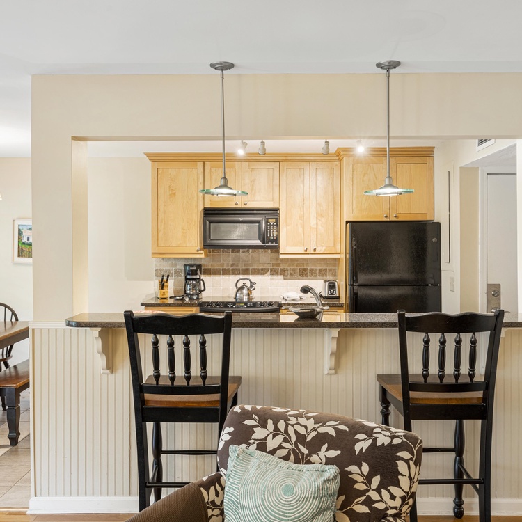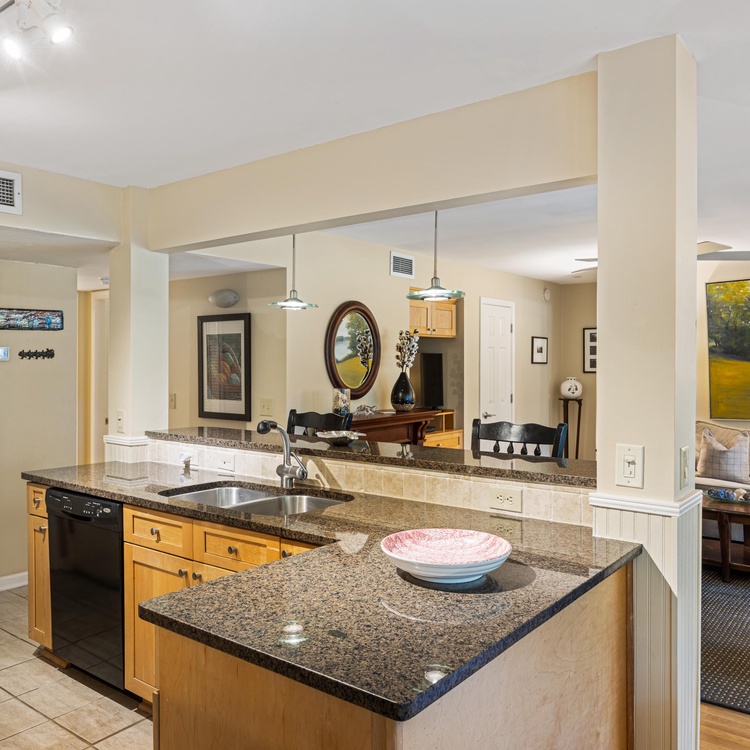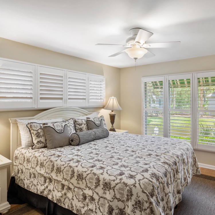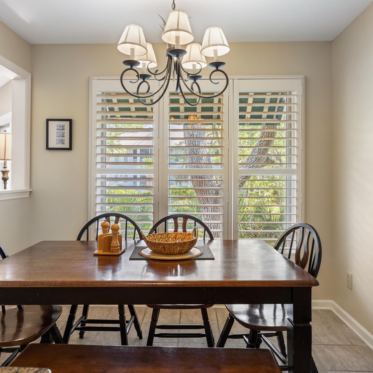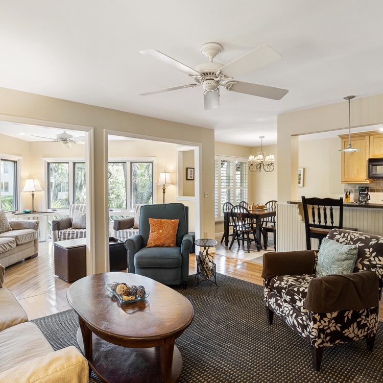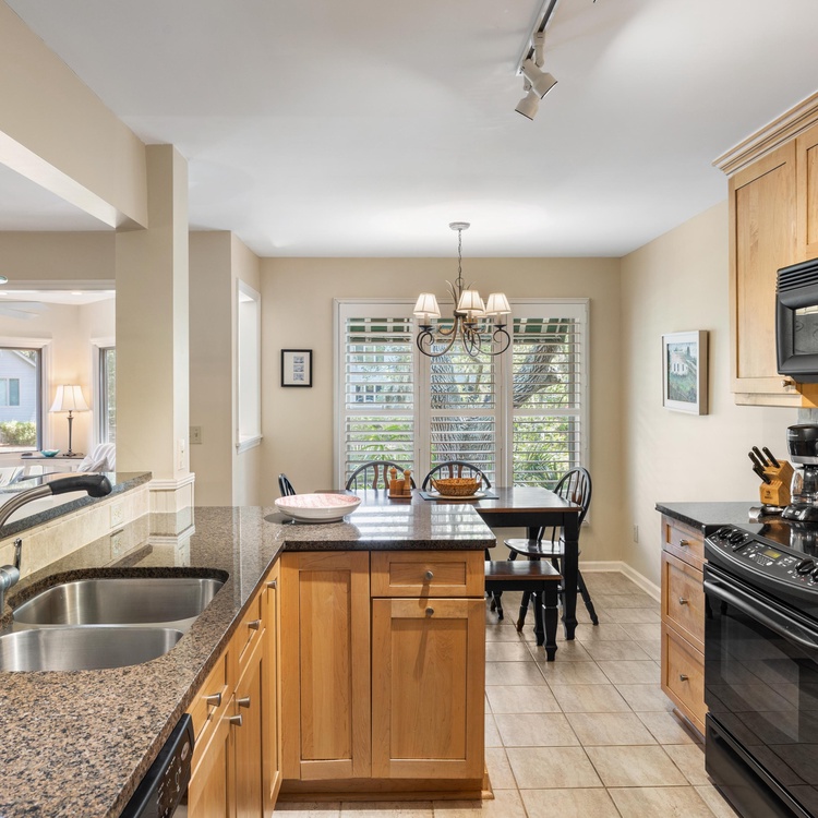 This first-floor Tennis Club villa features updates throughout and an open floor plan. The kitchen provides plenty of counter space and has an elevated bar with seating. The dining area, right off of the kitchen, offers seating for six and overlooks the lagoon. The living room features comfortable seating and a TV and flows right into the sunroom, which also overlooks the lagoon.