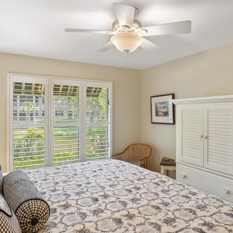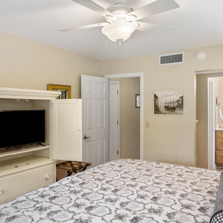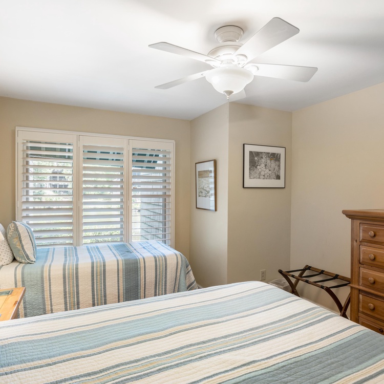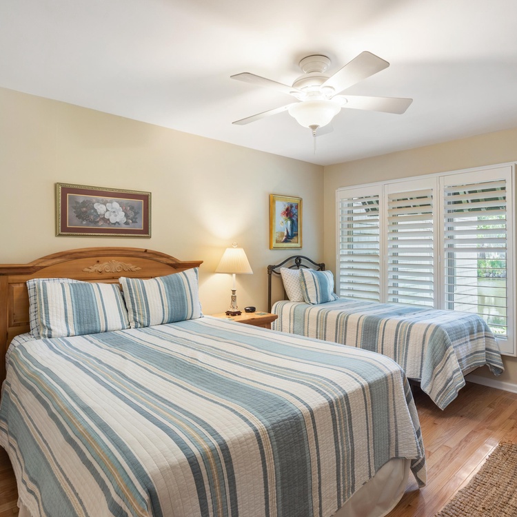 The primary suite, located off of the living room, offers a king-sized bed, lagoon views, and a TV. The private, en suite bathroom has double sinks and a large glass shower. The second bedroom, with a full bed and a twin bed, is off of the other side of the living room and has its own hall bath with a shower/tub combination.