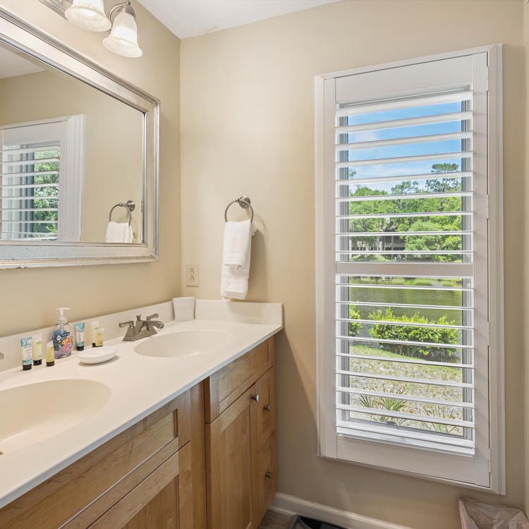 This Kiawah Island vacation rental offers two bedrooms and bathrooms, overlooks the lagoon, and is about a 10-minute walk to the beach.