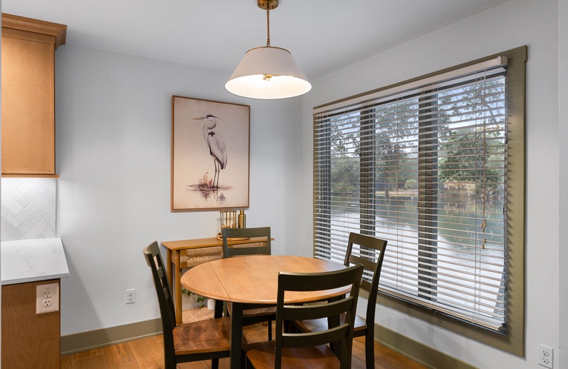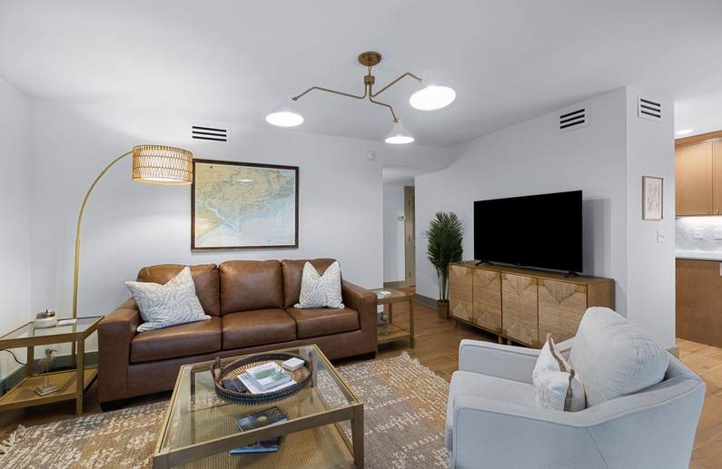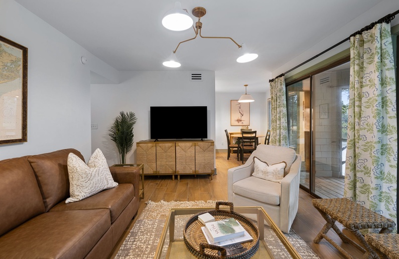 Living and Dining: The bright and inviting open living area features a leather sleeper sofa, two comfortable chairs, and a large flat-screen TV for relaxing after a day of island adventures. Adjacent to the kitchen, the dining area comfortably seats four and overlooks the peaceful lagoon.
