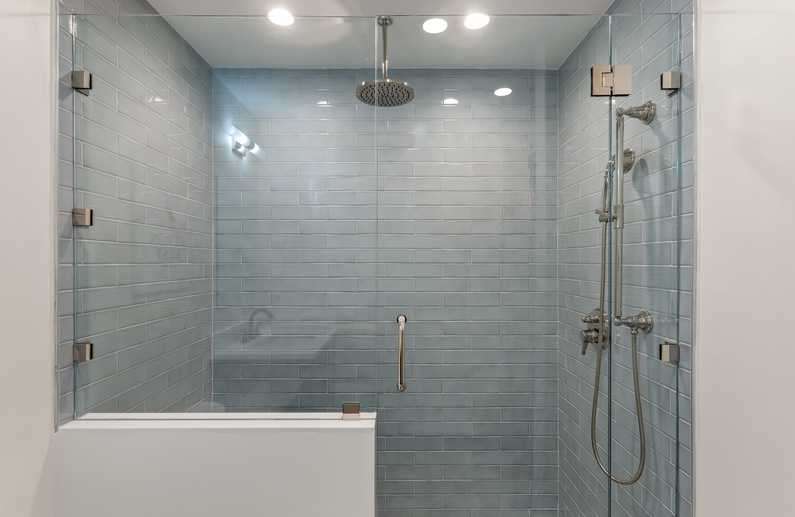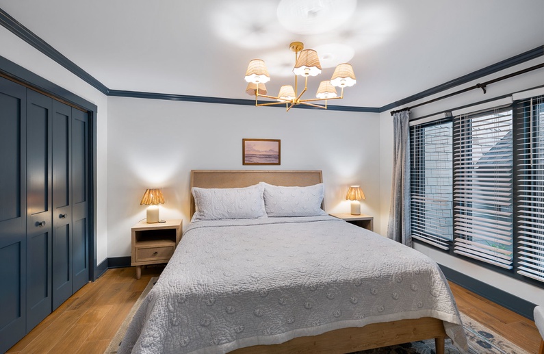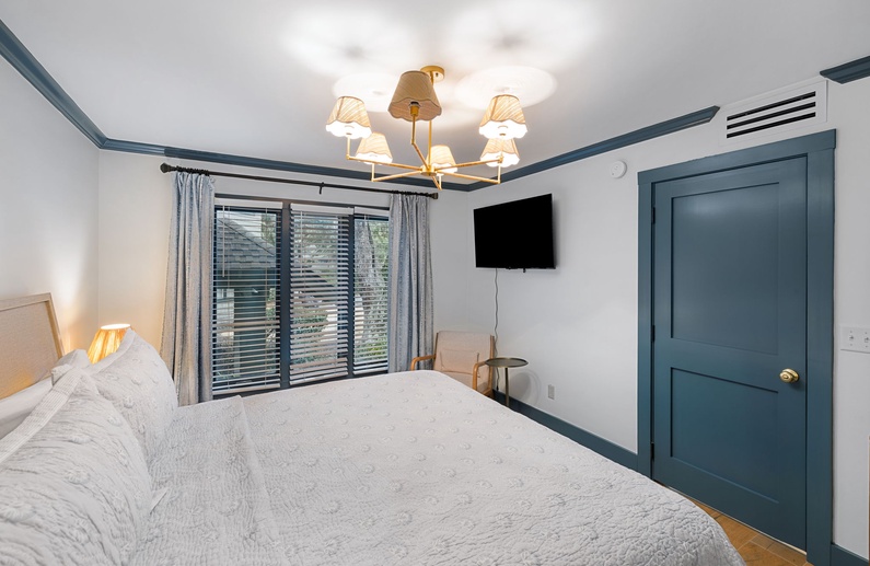 Bed and Bath: The calming bedroom offers a king-size bed and its own TV. The attached, fully renovated bathroom feels clean and spa-like, featuring a modern walk-in shower with a luxurious rainfall shower head.
