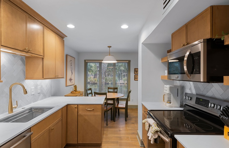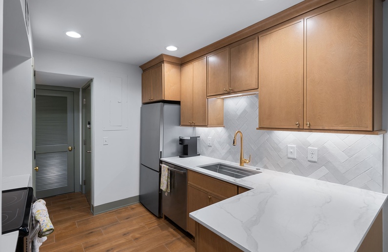 Kitchen: The stunning, fully reimagined kitchen boasts marble-inspired quartz countertops, a crisp white chevron backsplash, stainless steel appliances, and eye-catching gold hardware. It is fully equipped for all your culinary needs.