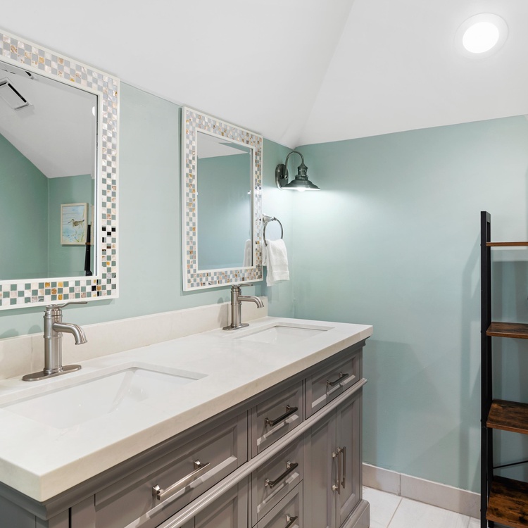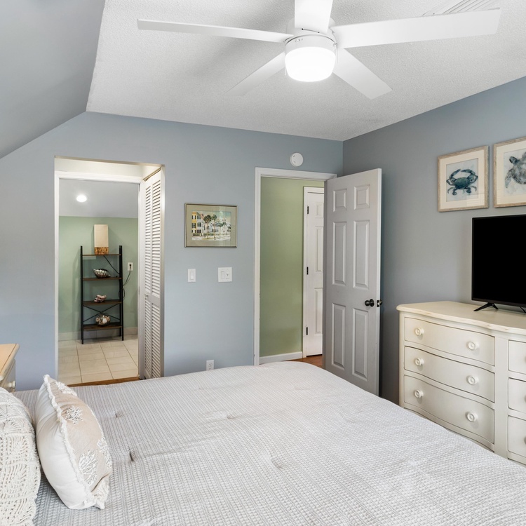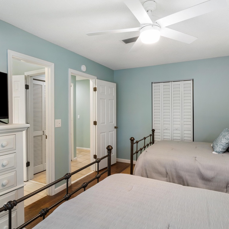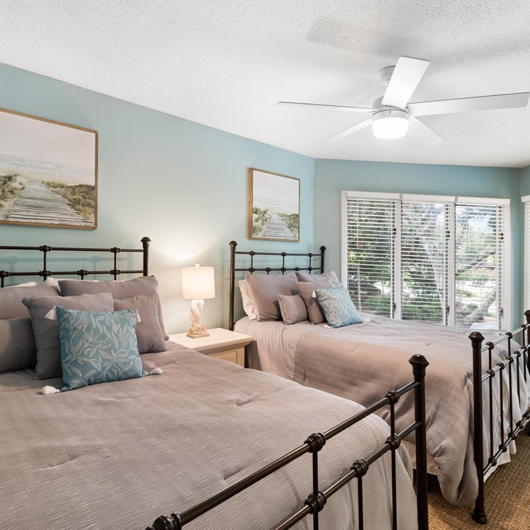 The primary suite features a king-sized bed, a TV, and easy access to the screened porch. The large bathroom features double sinks and a tile shower. The second bedroom features two full beds, a TV, and a bathroom with a bathtub/shower combination.