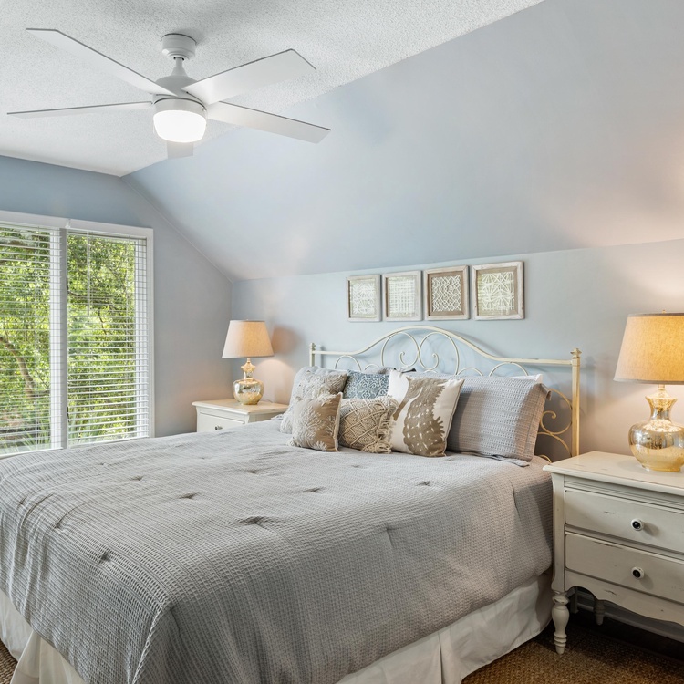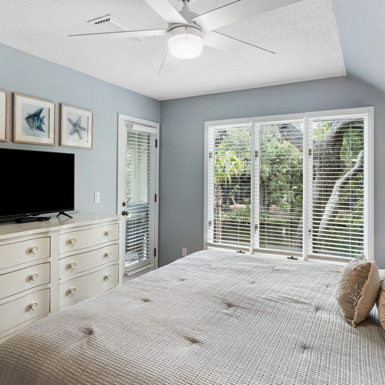 Upon entering this second-floor Tennis Club villa, you are greeted with tile floors and a fully equipped kitchen featuring stainless steel appliances and plenty of counter space to prepare meals during your stay. The kitchen opens up to the dining room with a table and seating for 4 and has convenient access to the screened porch. Hardwood floors, a comfortable sofa, two chairs, and a TV make the living room a great place for entertaining family and friends. Sliding glass doors open up to the large screened porch with seating for four to enjoy the spectacular second-floor lagoon views.