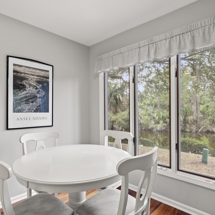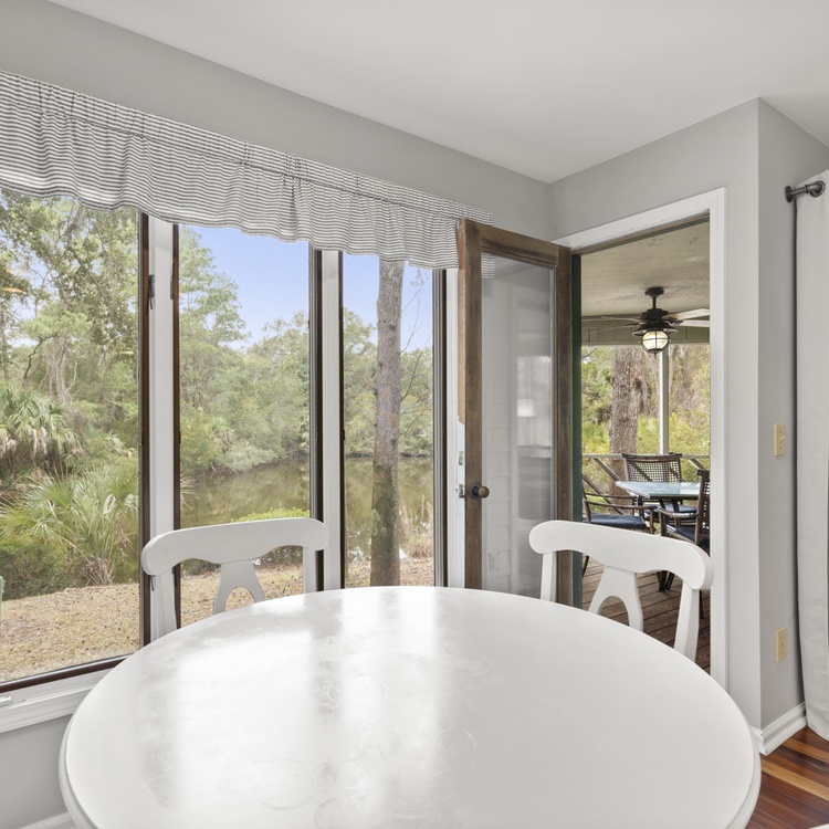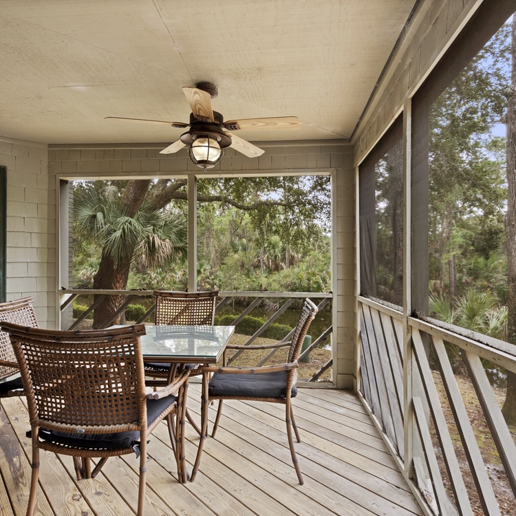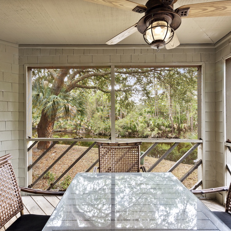 This Kiawah Island vacation rental features two bedrooms, lagoon views, and a screened porch. The villa is located steps from the bridge to beach access and about a 5-minute walk from the sand.