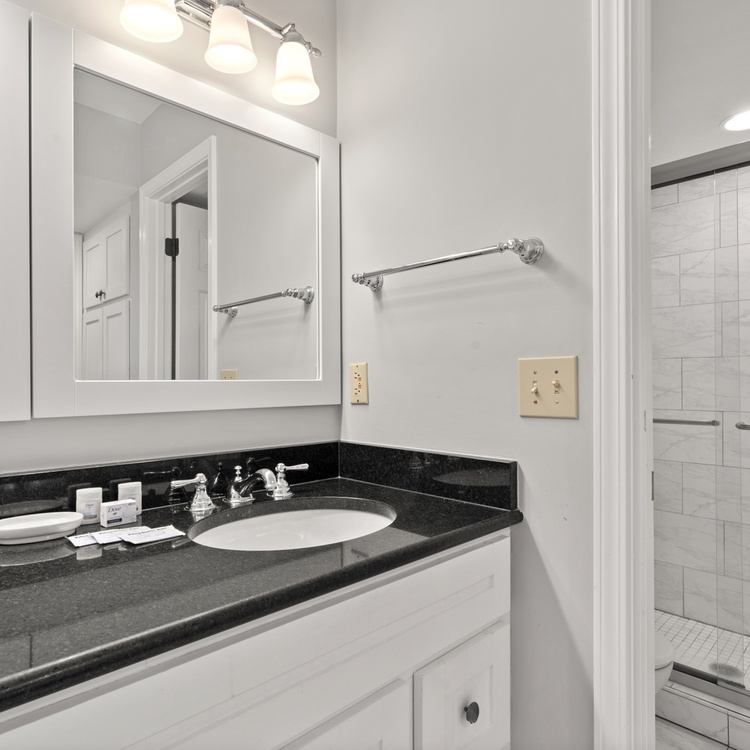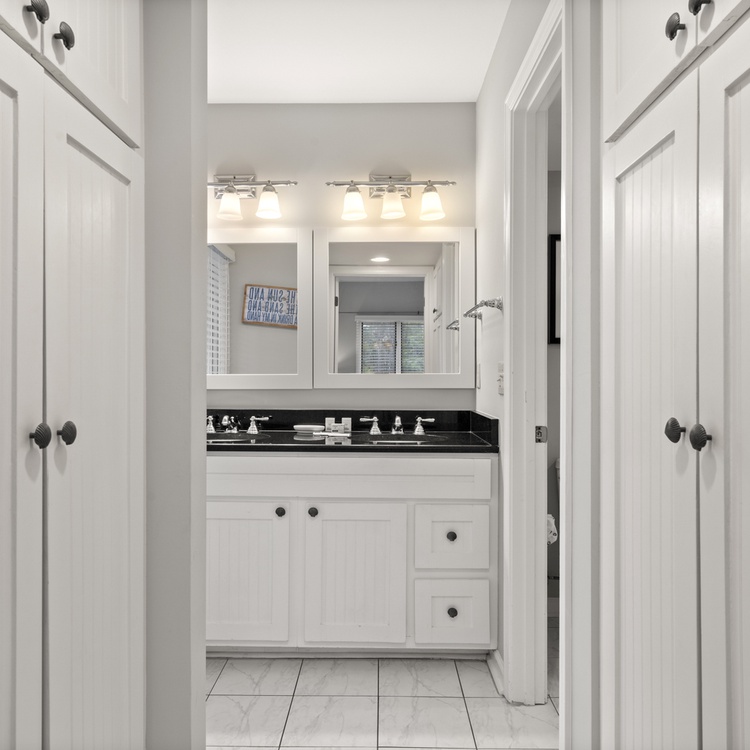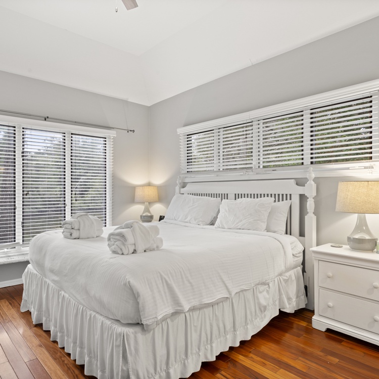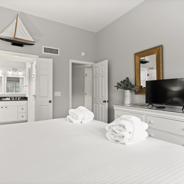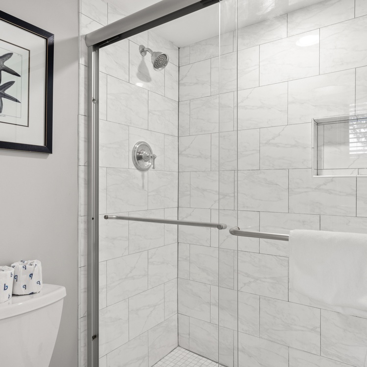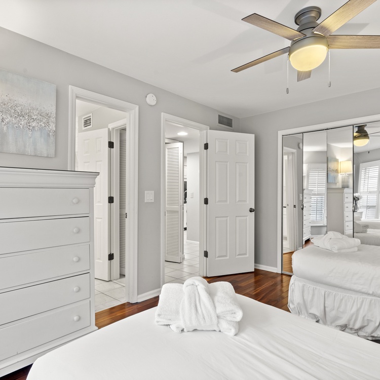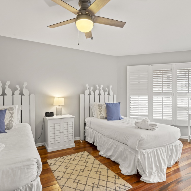 Recharge after beach days in one of the villa’s two bedrooms. The primary bedroom boasts a king-sized bed, a TV, and a private bathroom with a tiled walk-in shower. The second bedroom, housing two twin beds and a TV, is an inviting space for kids or friends. This bedroom has access to its own bathroom with a shower/tub combo.