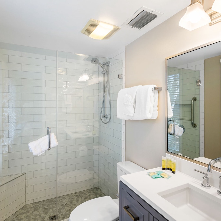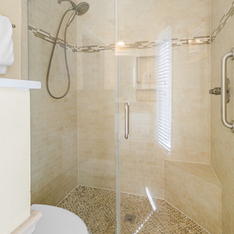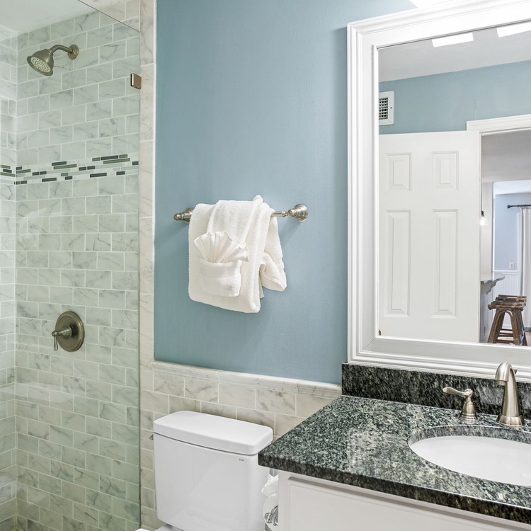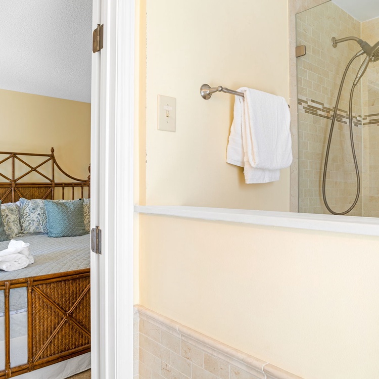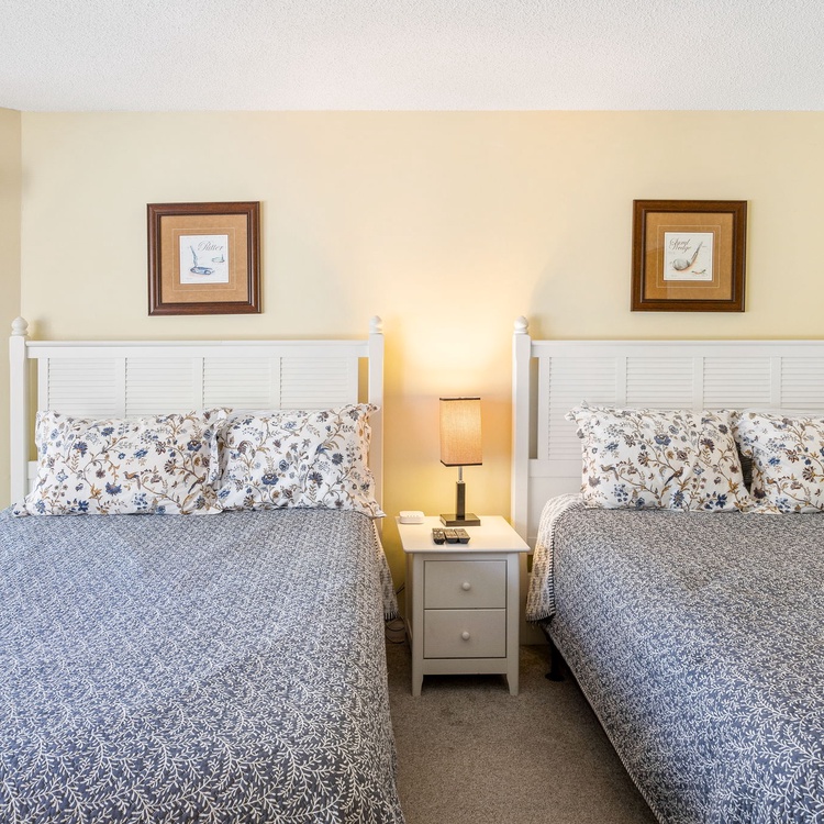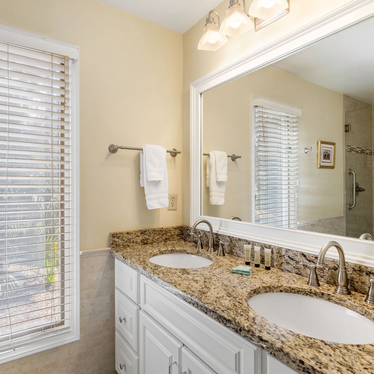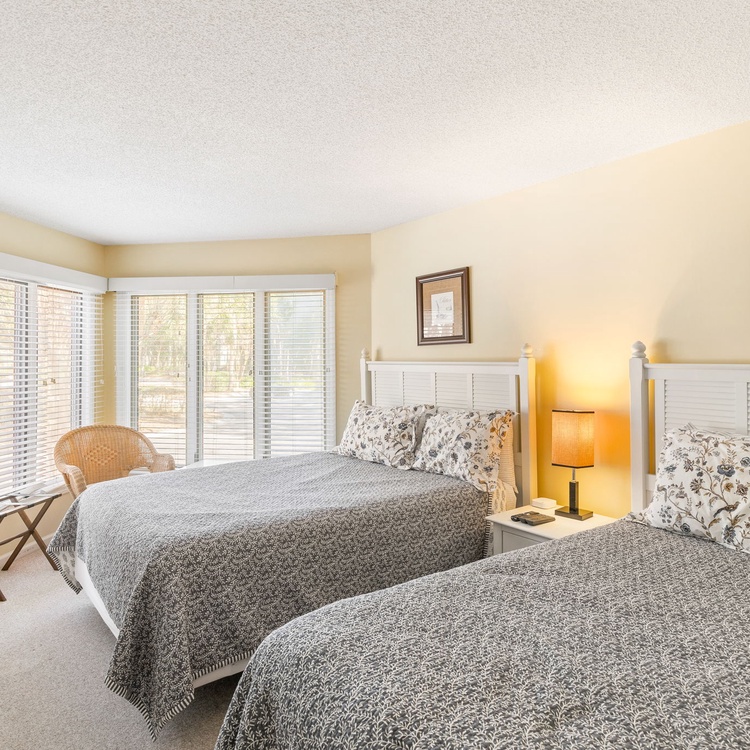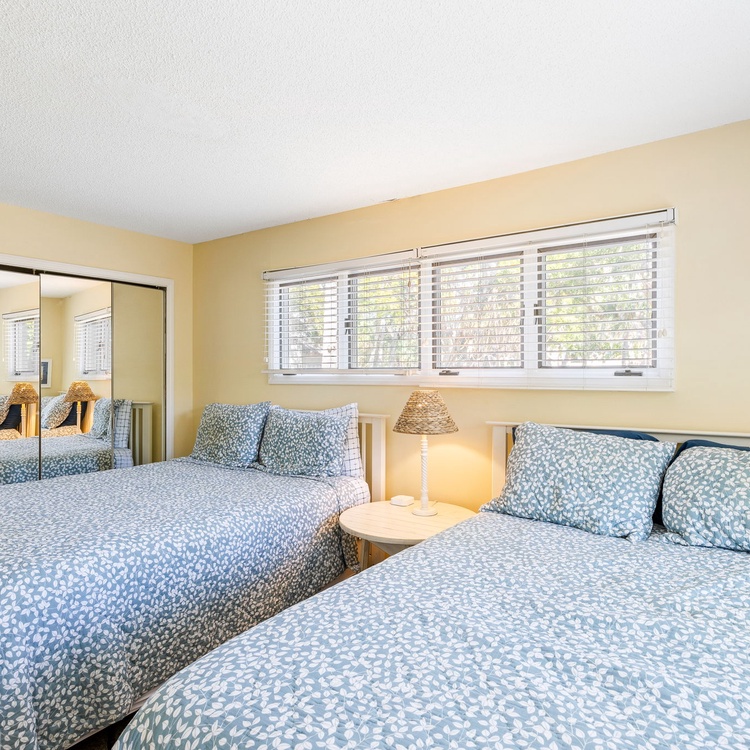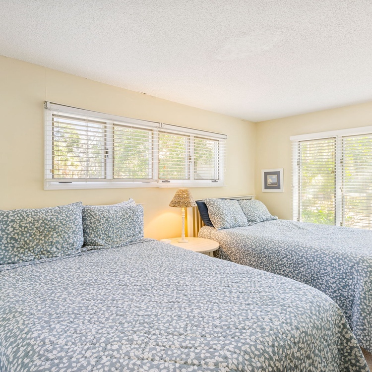 The primary suite has lagoon views and features a king bed, flat screen TV, and updated bathroom with double sinks and tile shower. Two additional bedrooms feature two queen beds each, allowing everyone in your party to have their own bed. One bedroom offers two queen beds, a flat screen TV, and a private bathroom with shower/tub combination. The second bedroom features two queen beds, a flat screen TV, and bay window with sitting area and has private entry to the updated hall bathroom with tile shower.