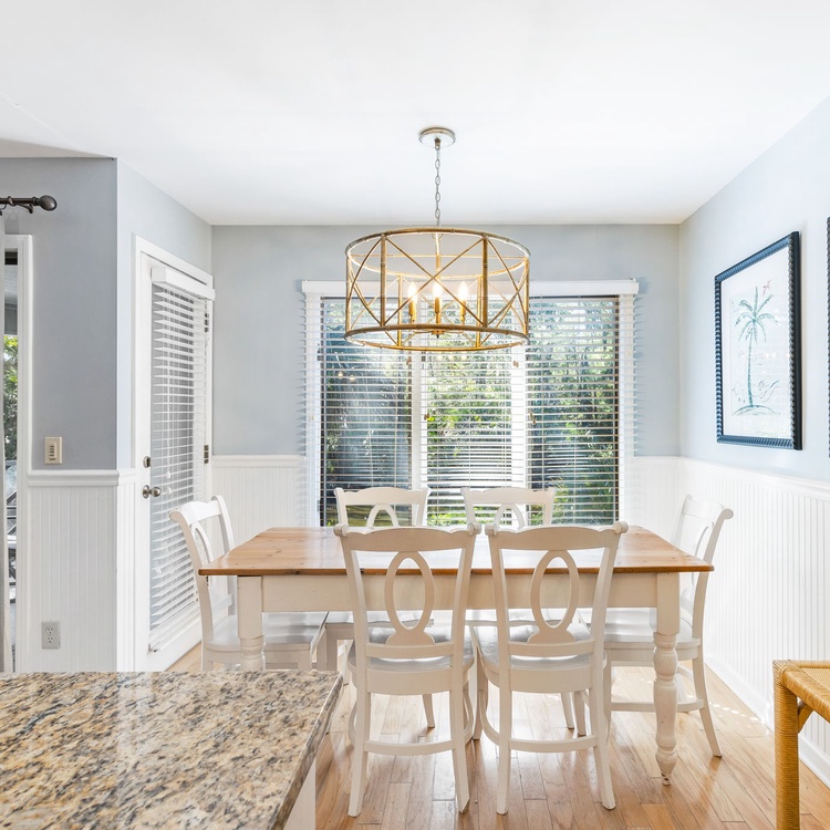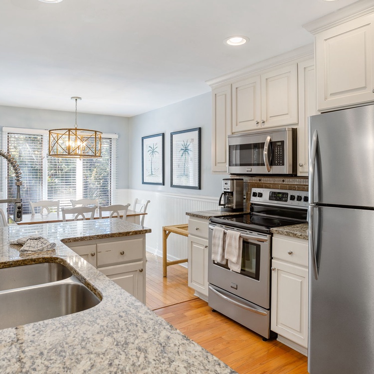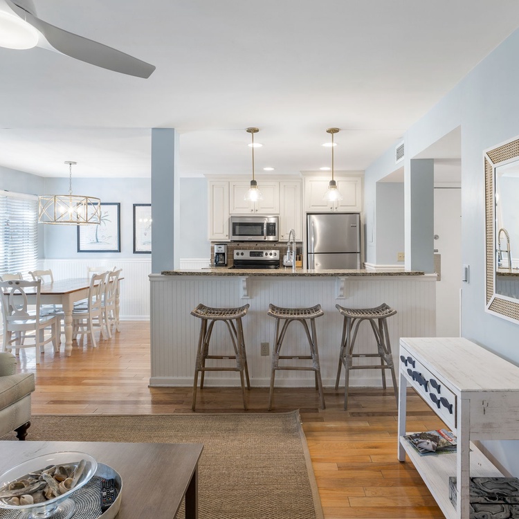 The living room features a wall of sliding glass doors that open directly to the screened porch. A Comfortable sofa, loveseat, chair, TV, and games make the living room a welcoming place to gather and entertain with family and friends. The renovated kitchen is open to the living room and dining area and offers seating at the bar. The kitchen features beautiful granite countertops and stainless steel appliances and is fully equipped for preparing meals during your stay. The dining area offers lagoon views and has convenient access to the screened porch. The screened porch features a table and chairs for al fresco dining or soaking in the view.