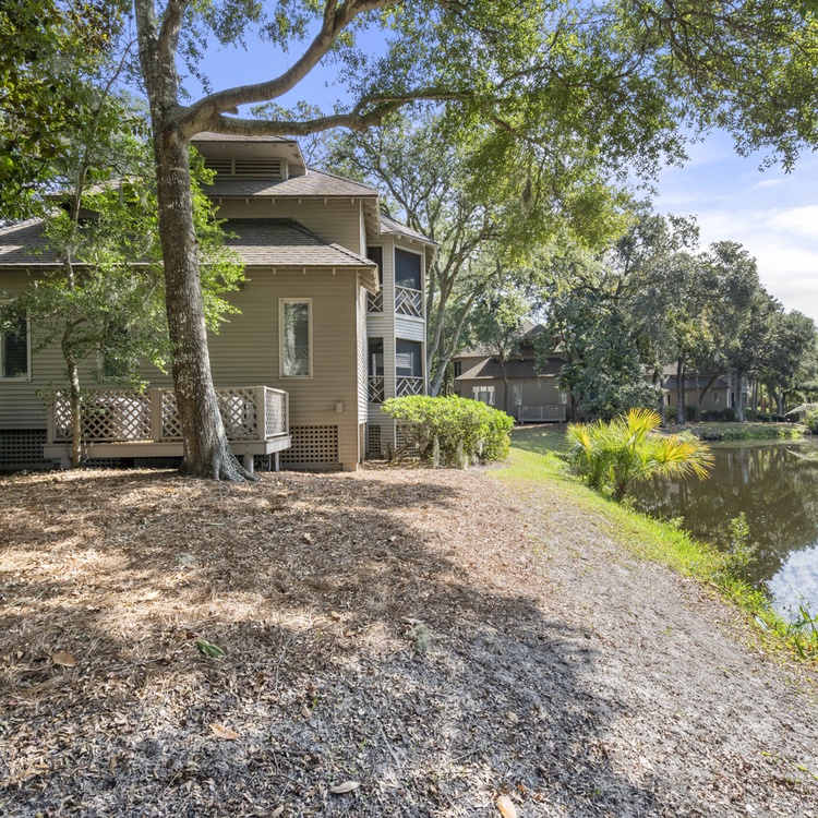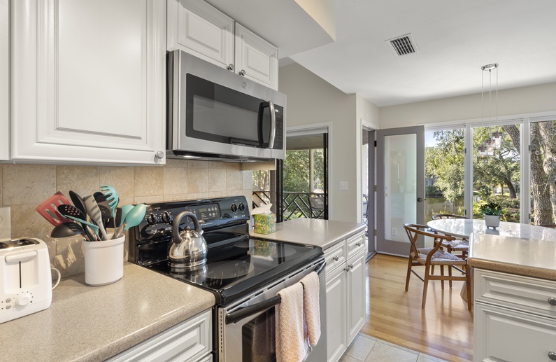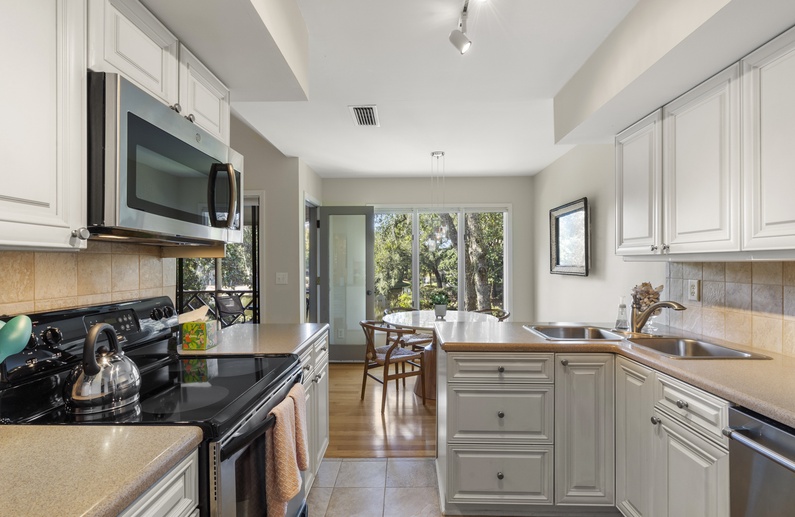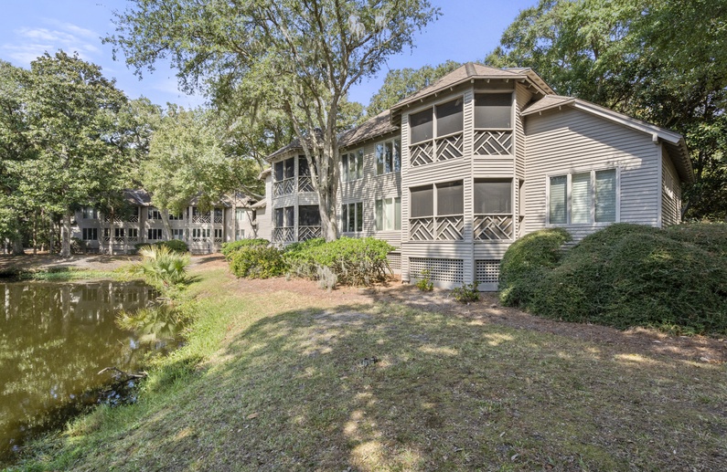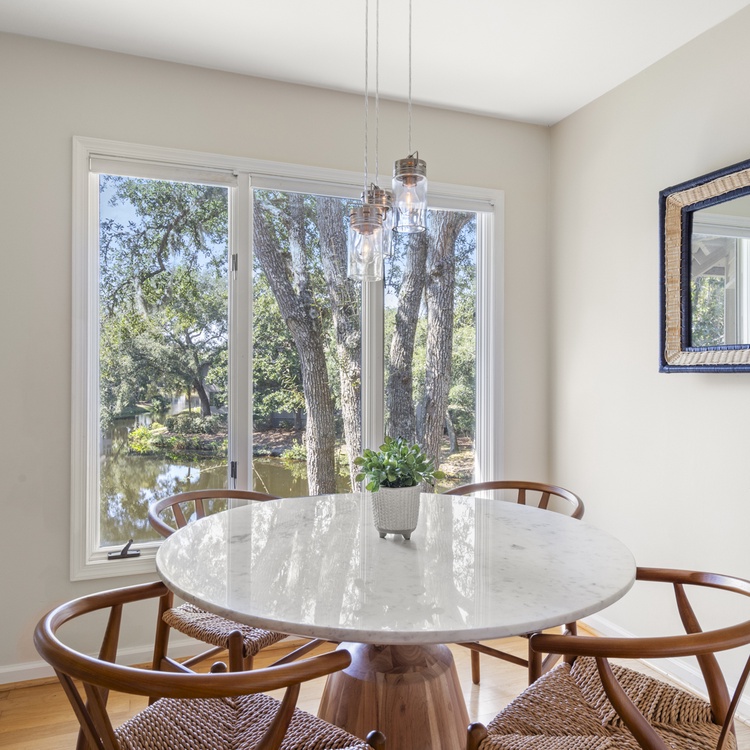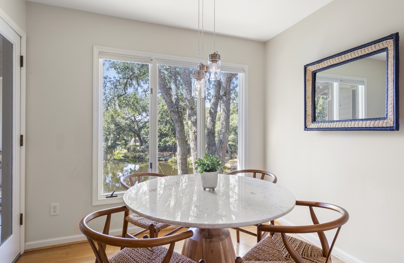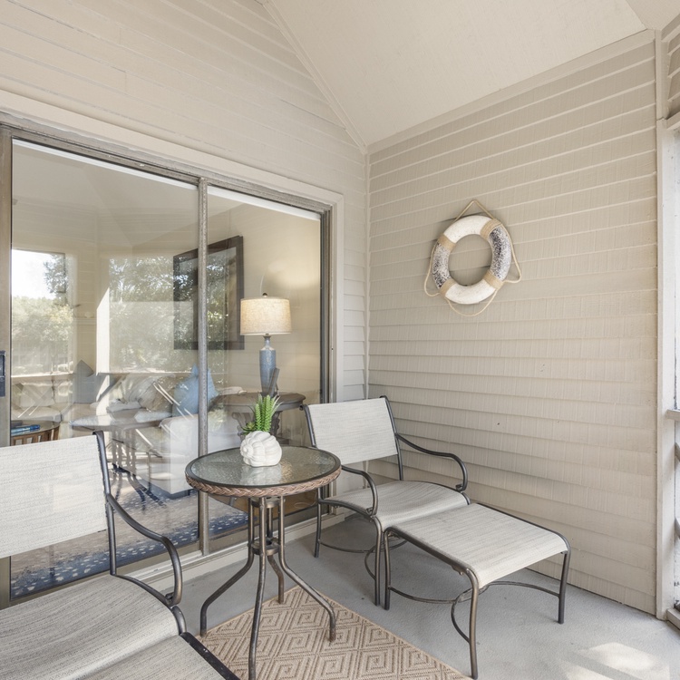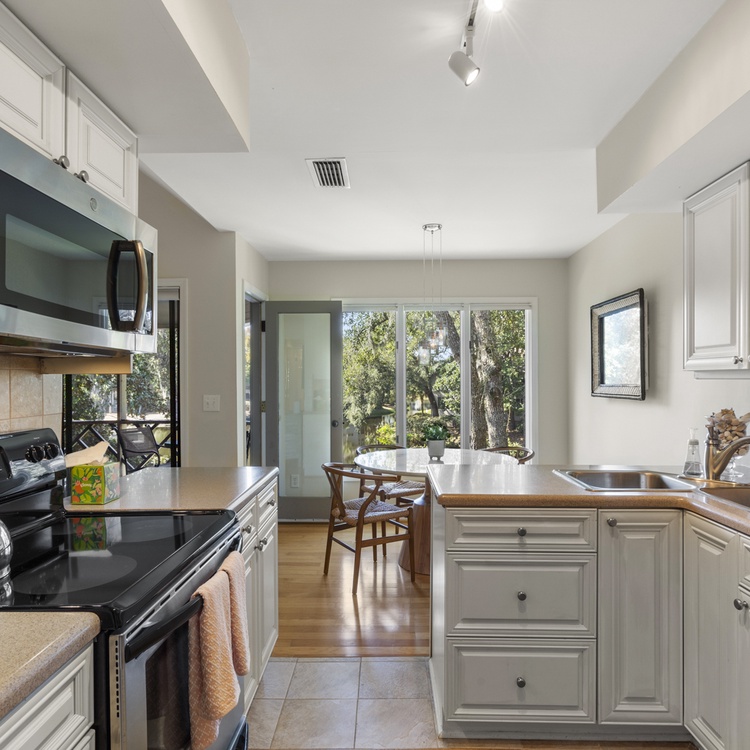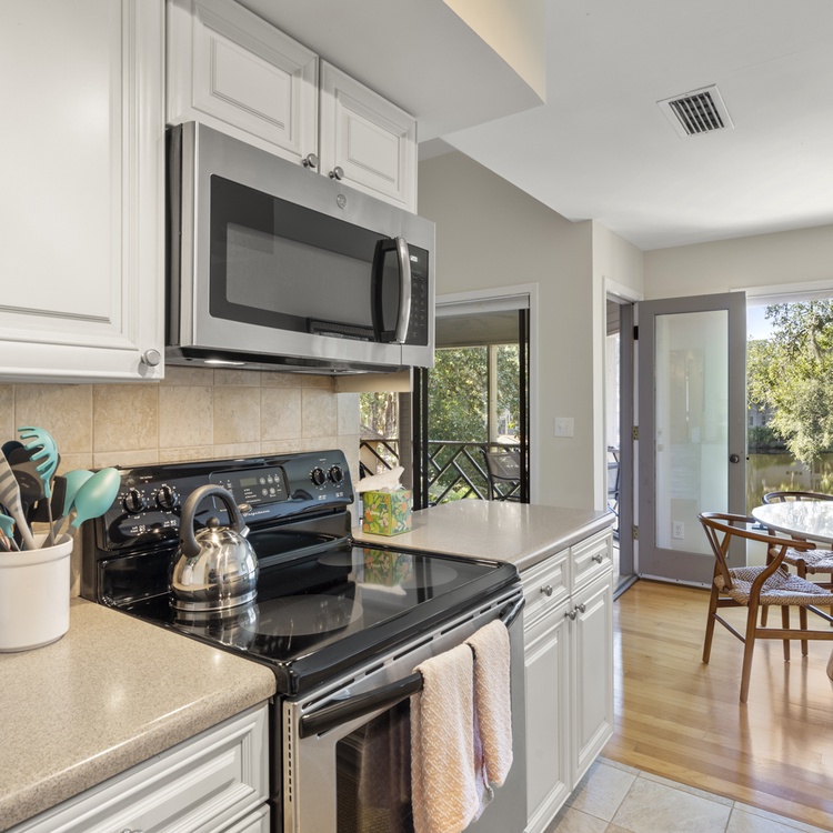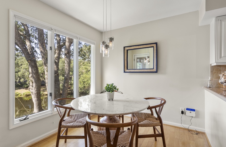 Conveniently situated in Kiawah's East Beach area, this second-floor Turtle Cove villa offers a central location in a serene setting. The main living area welcomes you with sweeping lagoon views and offers comfortable seating, a wall-mounted TV, and access to the screened porch. Continue to the fully-equipped kitchen, where you will find white cabinets, stainless steel appliances, and plenty of space for meal preparation. The adjacent dining area has a wonderful view of the water and is the perfect place to eat, snack, or play a game of cards.